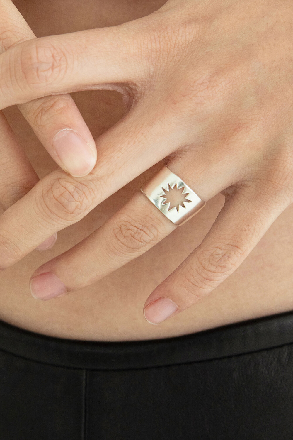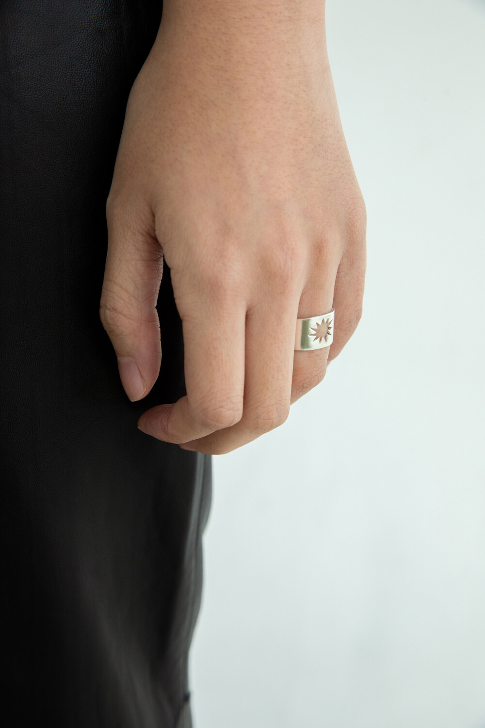태양과 별의 모습을 닮은 문양이 투각 되어 있는 반지입니다. 볼드한 듯 보이지만 실제로는 적당한 두께감으로 활동 시 편안한 착용감을 느낄 수 있는 제품입니다. 정 사이즈 보다 1호수 크게 주문하는 것을 추천드립니다.