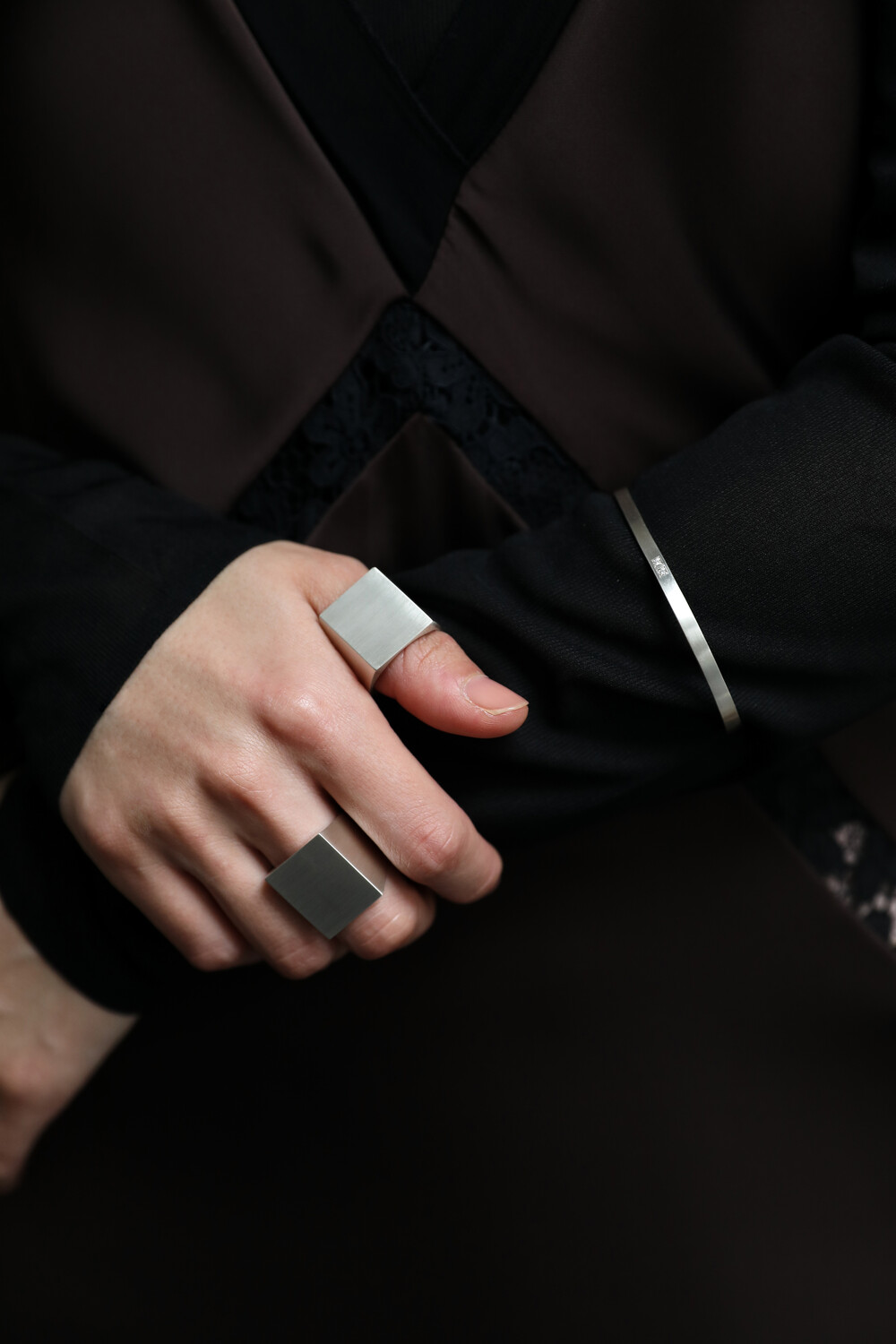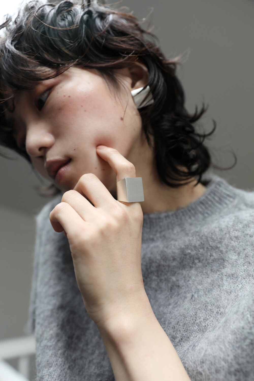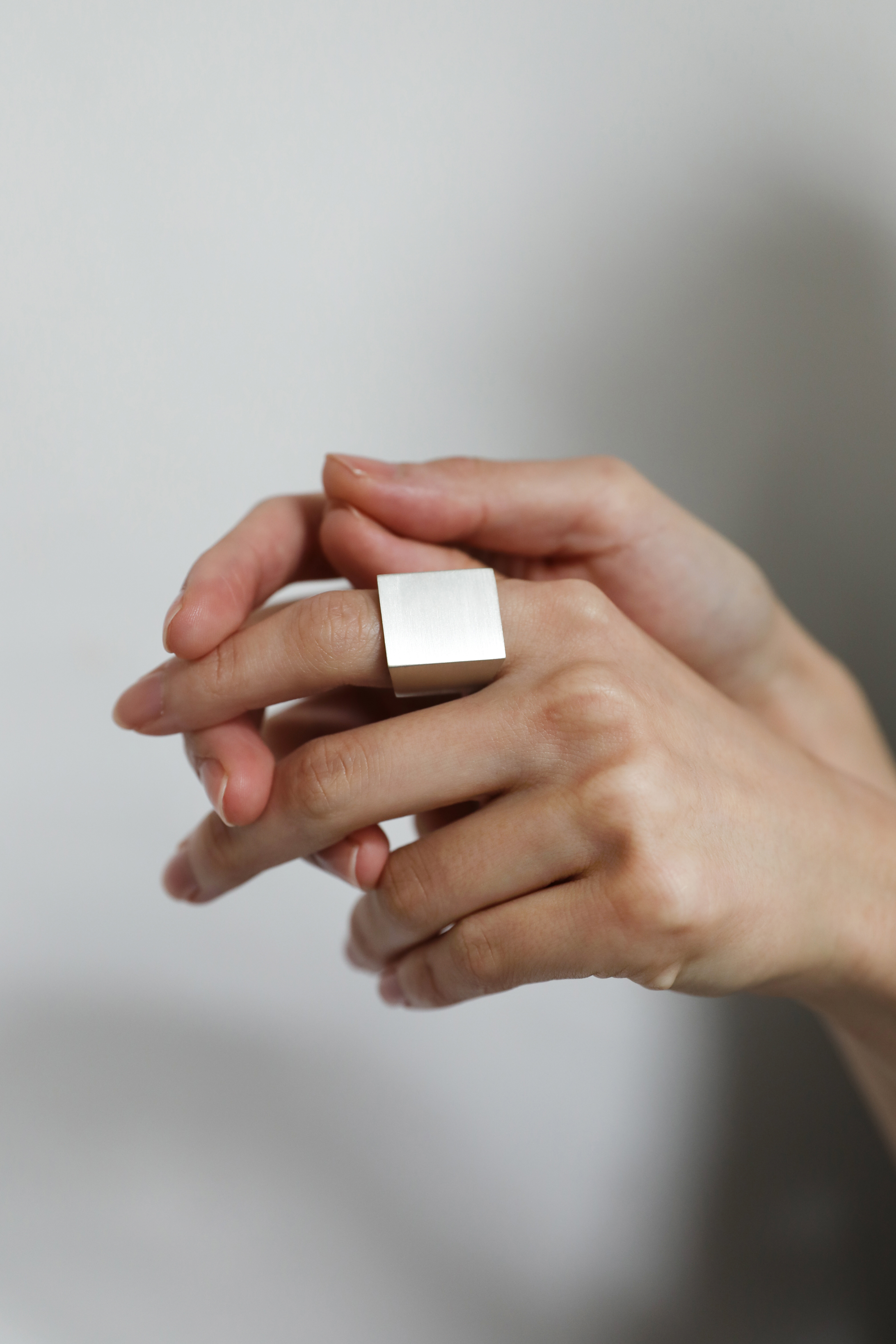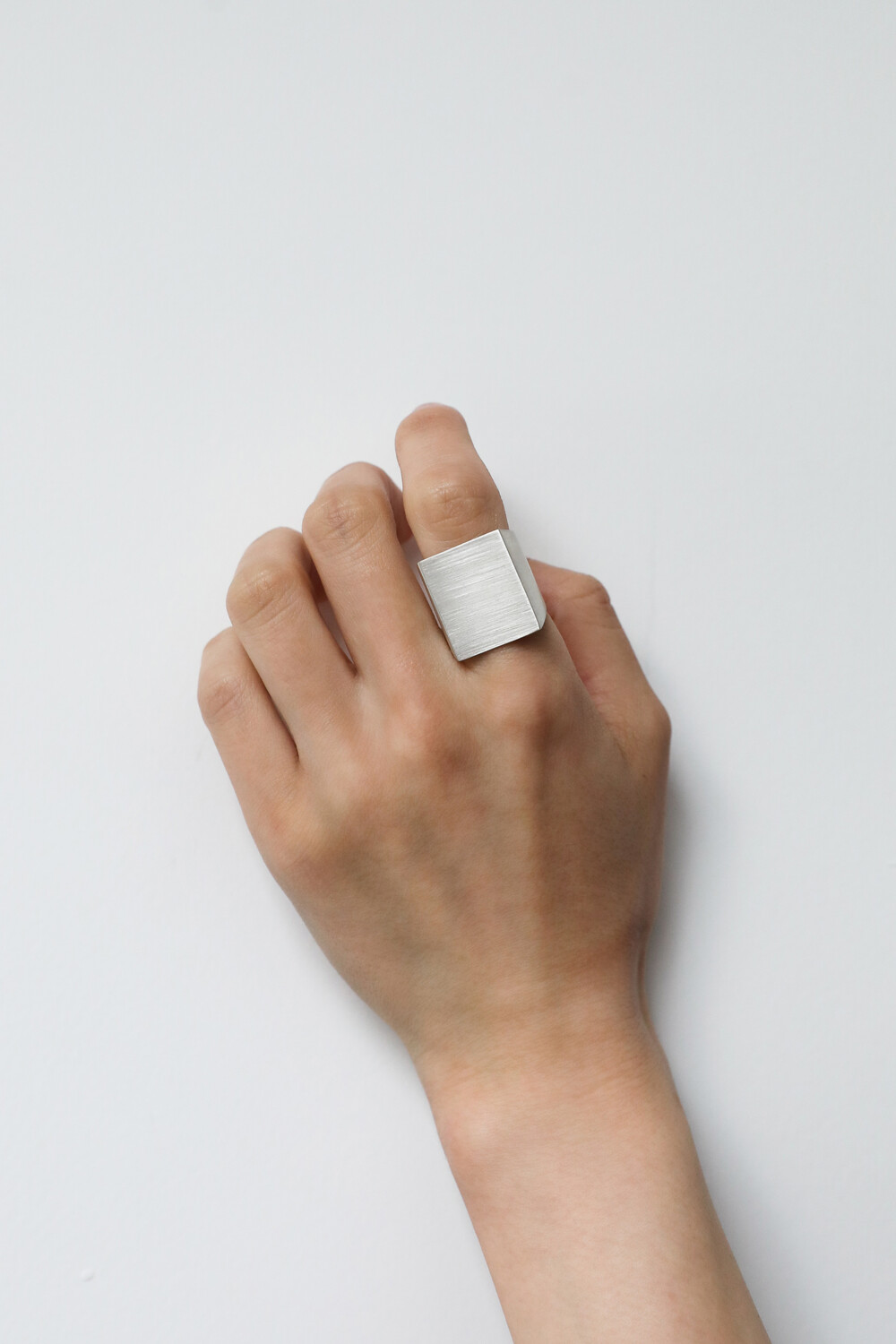 네모난 문 형태에 영감을 받아 제작한 반지입니다. 면이 뚜렷하게 살아 있는 실루엣이 모던한 인상을 줍니다. 볼드한 비례에도 불구하고 내부를 부드럽게 굴려 마감해 손에 닿는 감촉이 편안하며, 장시간 착용에도 부담이 적습니다. 표면은 은의 차분한 질감을 강조한 무광 처리로 마감했습니다.