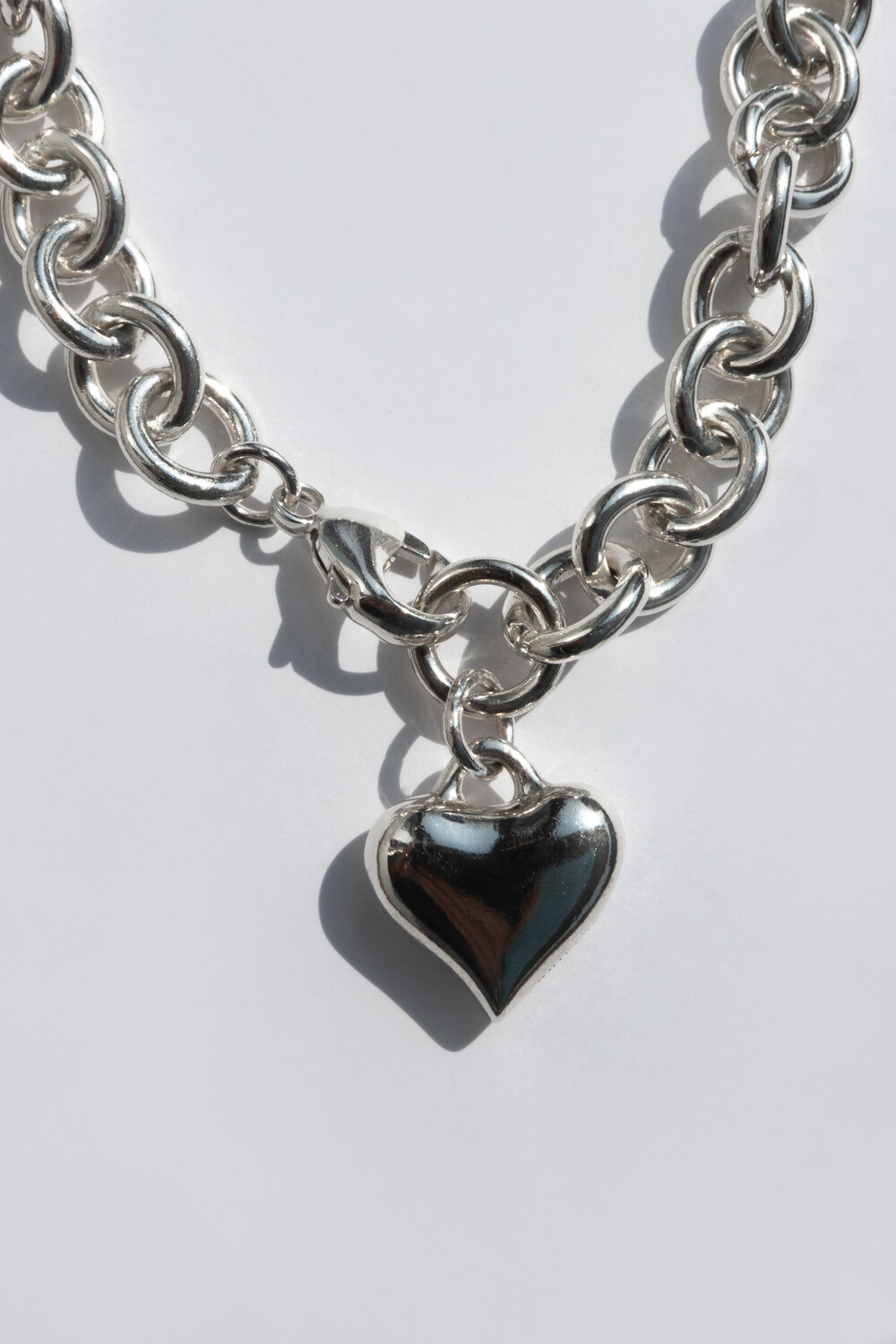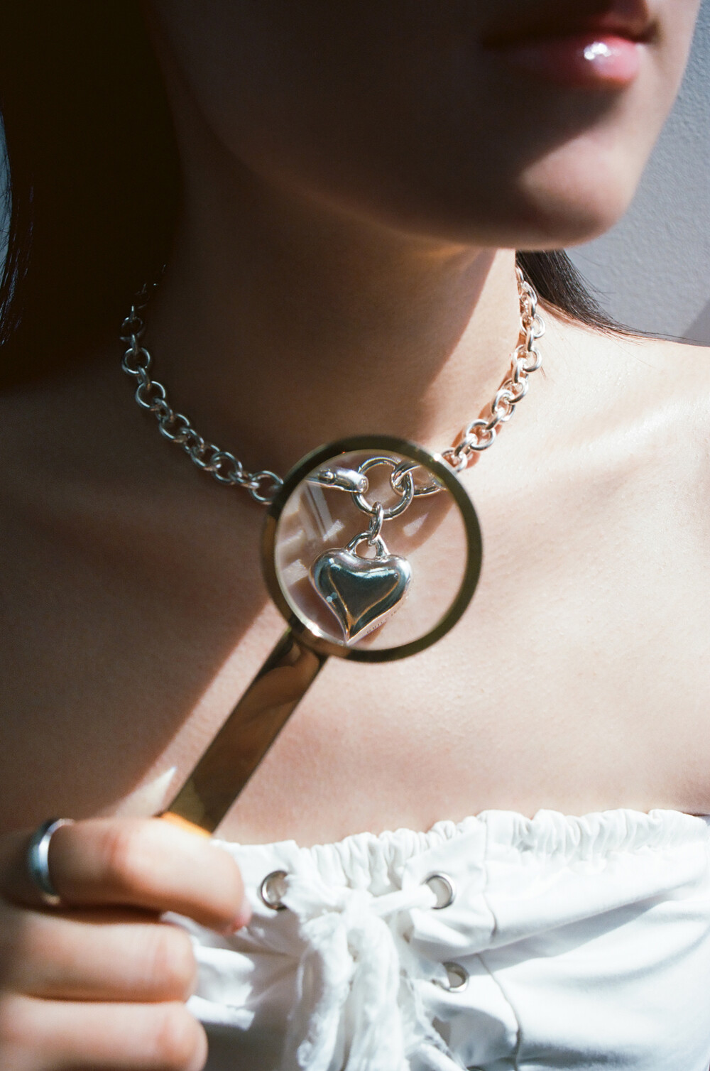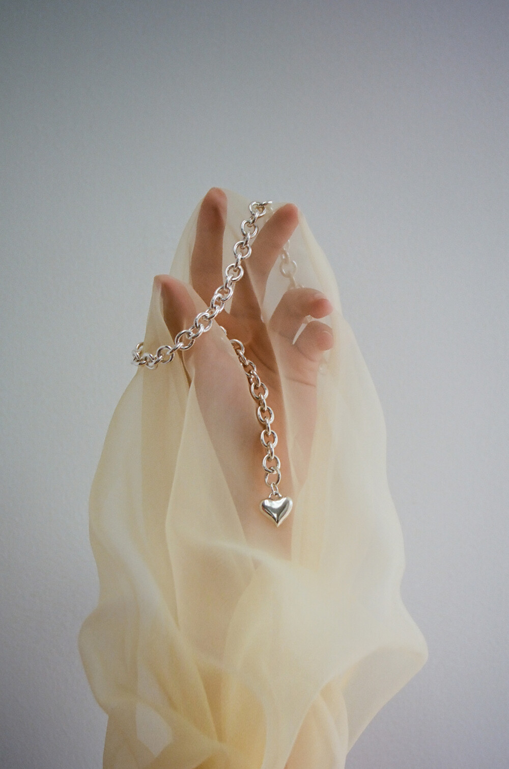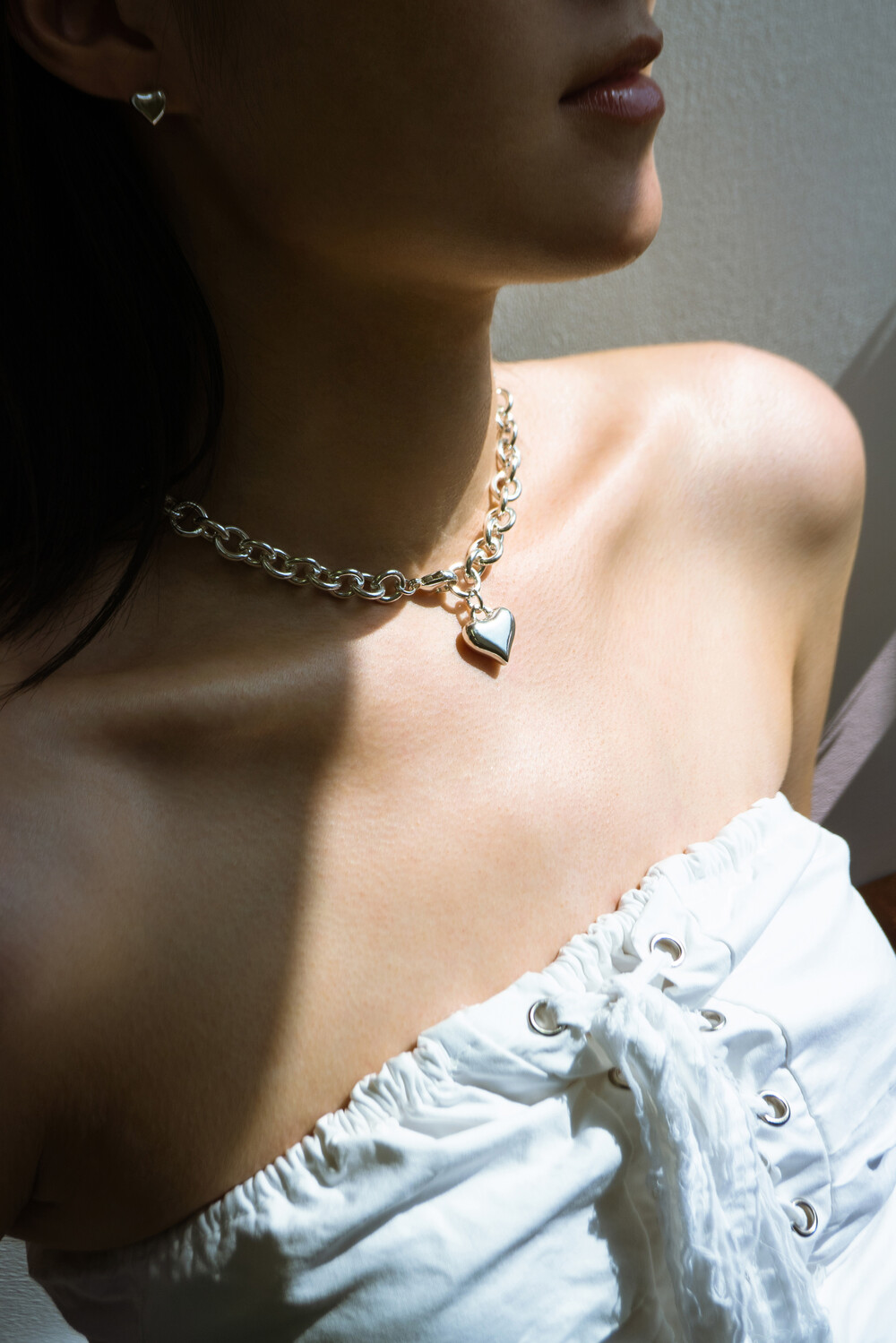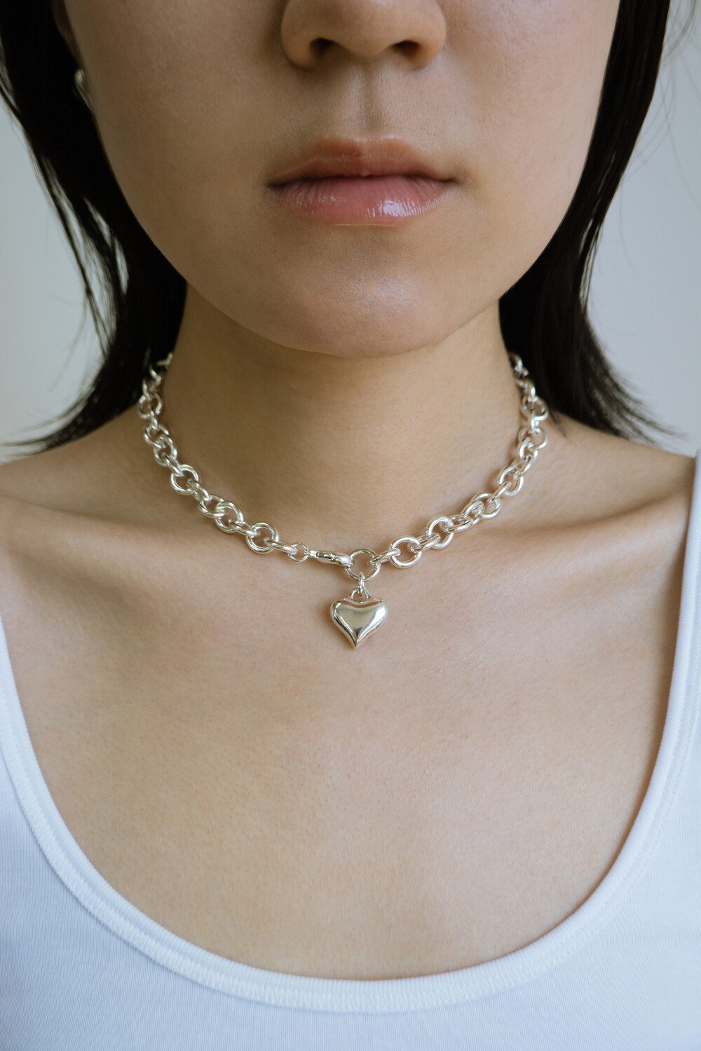 볼드하고 묵직한 이태리 체인의 확실한 존재감이 돋보이는 목걸이입니다. 하트 펜던트가 앞으로 오게 착용하는 제품으로 큼직한 잠금장치를 사용한 것이 특징입니다.
