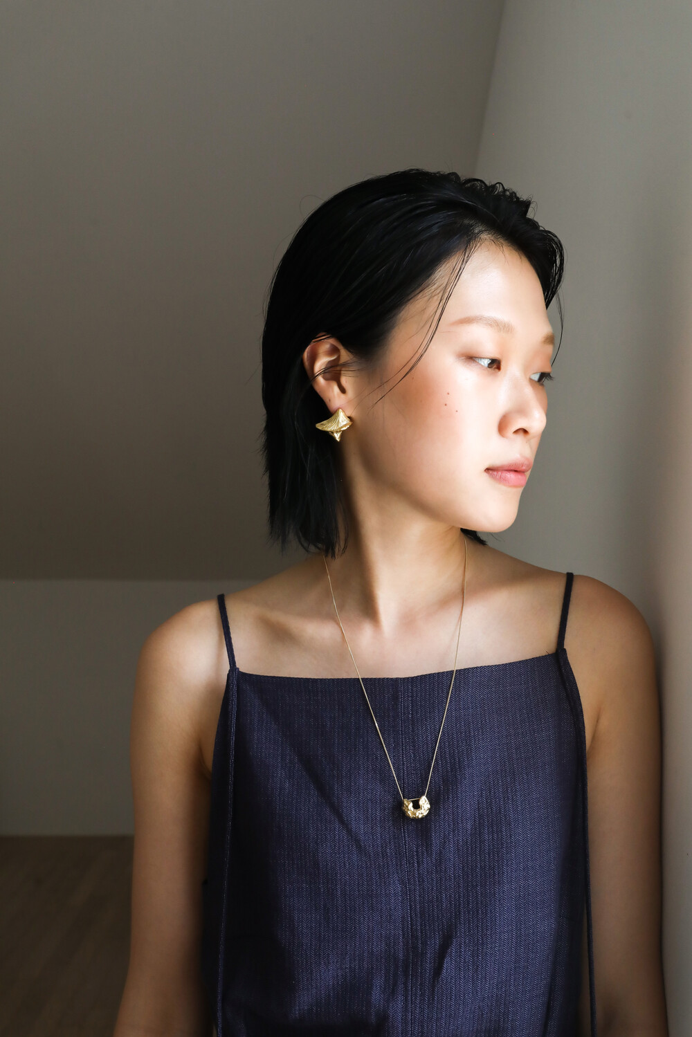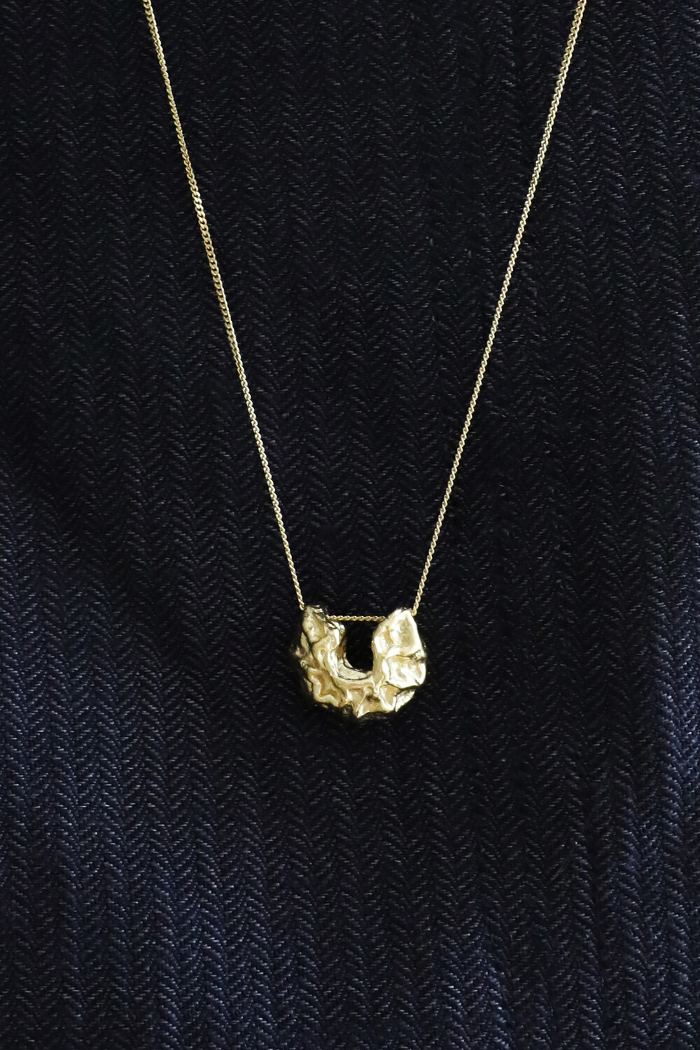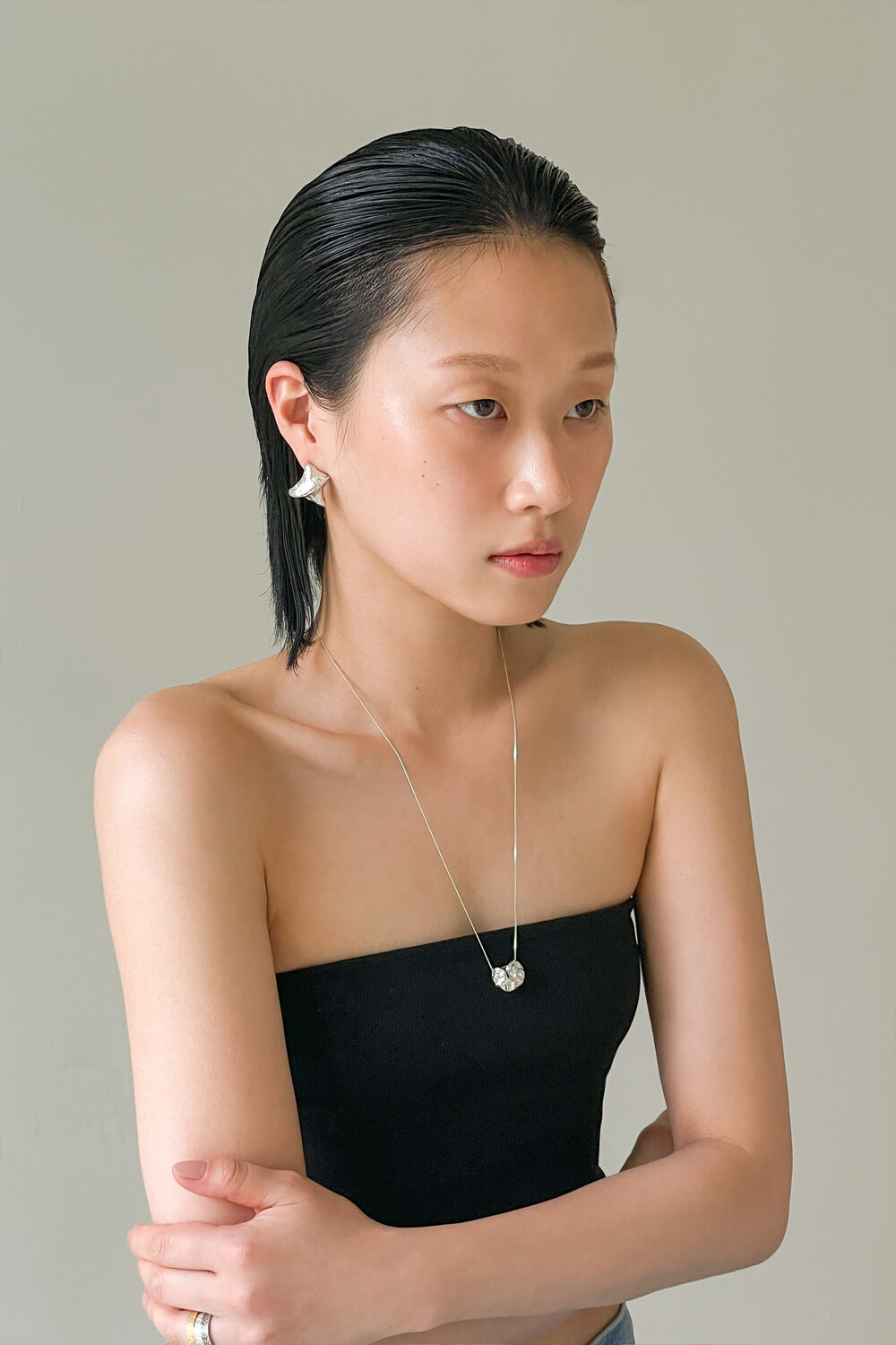 볼드한 형태와 독특한 질감이 매력적인 목걸이입니다. 속을 파내어 가볍게 착용이 가능한 것이 특징이며 60cm의 롱한 길이로 티셔츠나 원피스와 함께 연출하기 좋습니다.