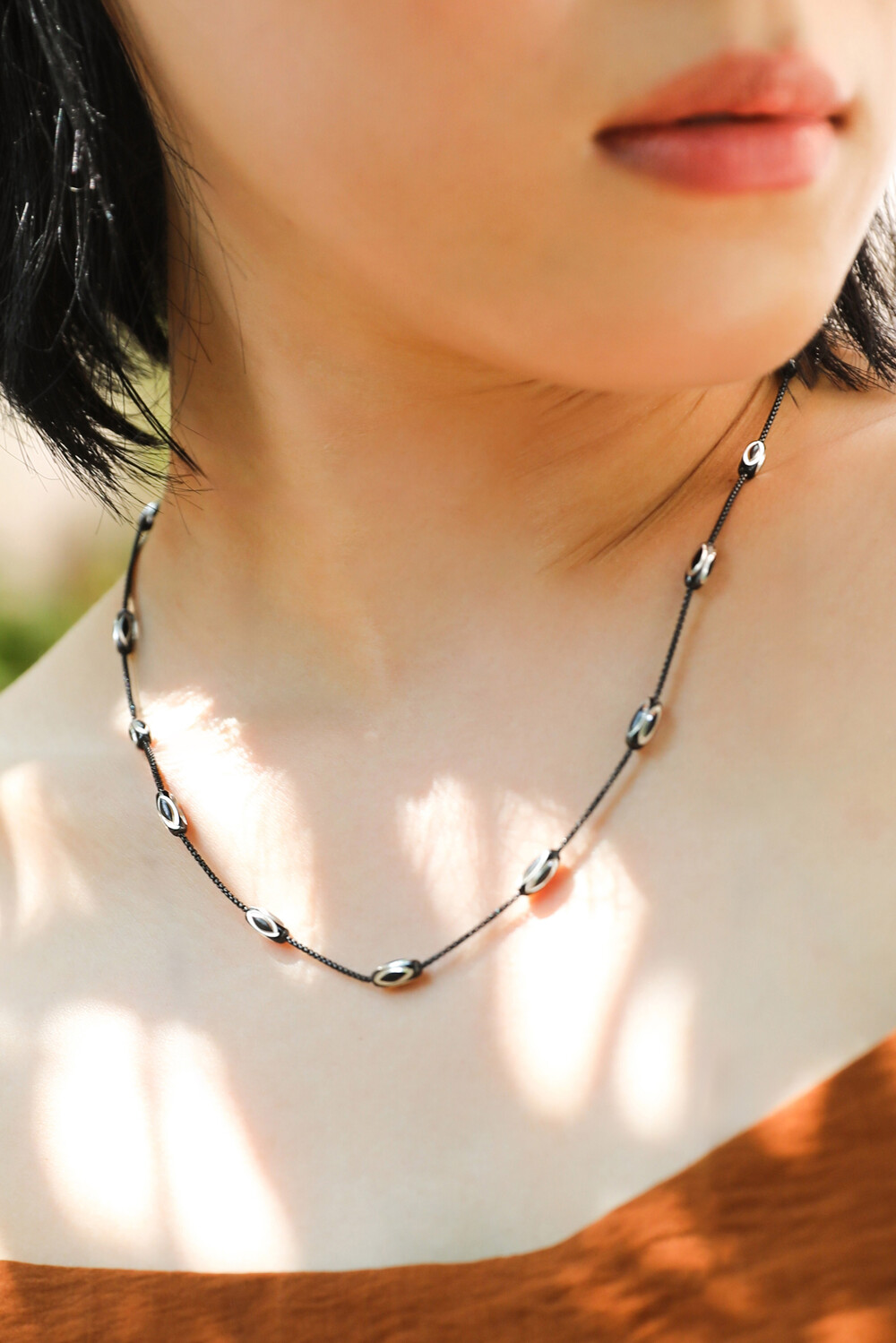 에스닉한 패턴이 매력적인 이태리 체인으로 제작한 목걸이입니다. 두 번 감아 발찌로 활용이 가능하며 체인의 끝에는 금속 참이 달려있어 포인트가 되어줍니다.