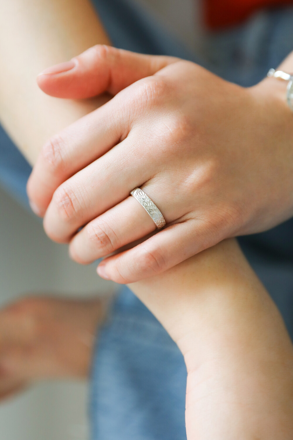 에스닉하고 불규칙한 패턴이 매력적인 반지입니다. 적당한 폭으로 제작되어 손가락이 통통한 분들도 편하고 예쁘게 착용하기에도 좋습니다. 모델컷 처럼 다른 반지와 함께 레이어드하는 것도 추천드려요.