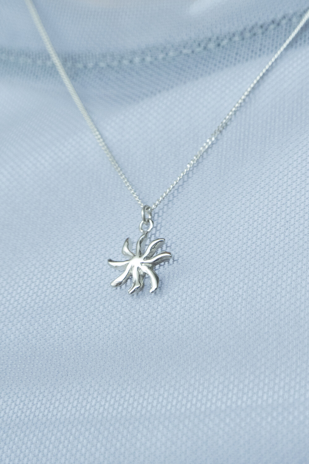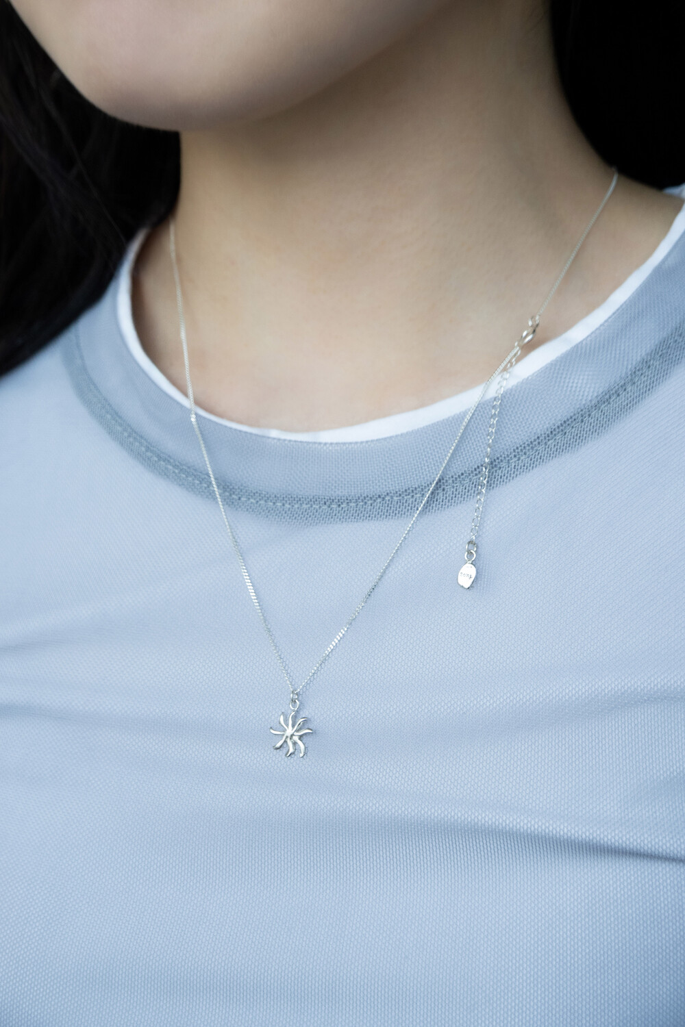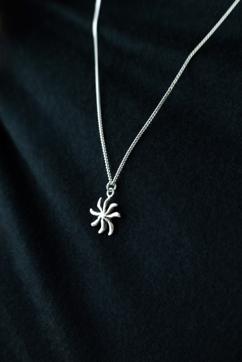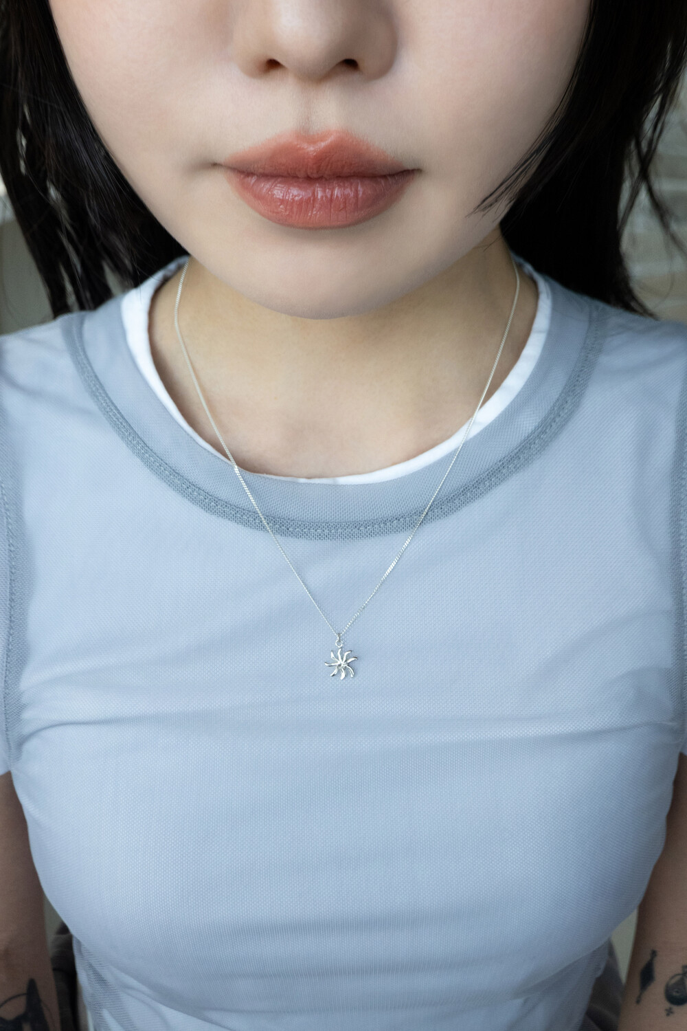 작은 태양 모양의 펜던트가 포인트가 되는 목걸이입니다. 자유로운 형태로 뻗은 디자인이 돋보이며, 가볍고 편하게 착용할 수 있도록 50~55cm의 여유로운 길이감으로 제작했습니다. 또한, 여유 체인 끝에 귀여운 돌멩이 모양의 펜던트를 더해 체인이 돌아가도 자연스럽게 포인트가 될 수 있도록 디자인했습니다. 반유광과 빈티지 질감 중 선택 가능합니다.
