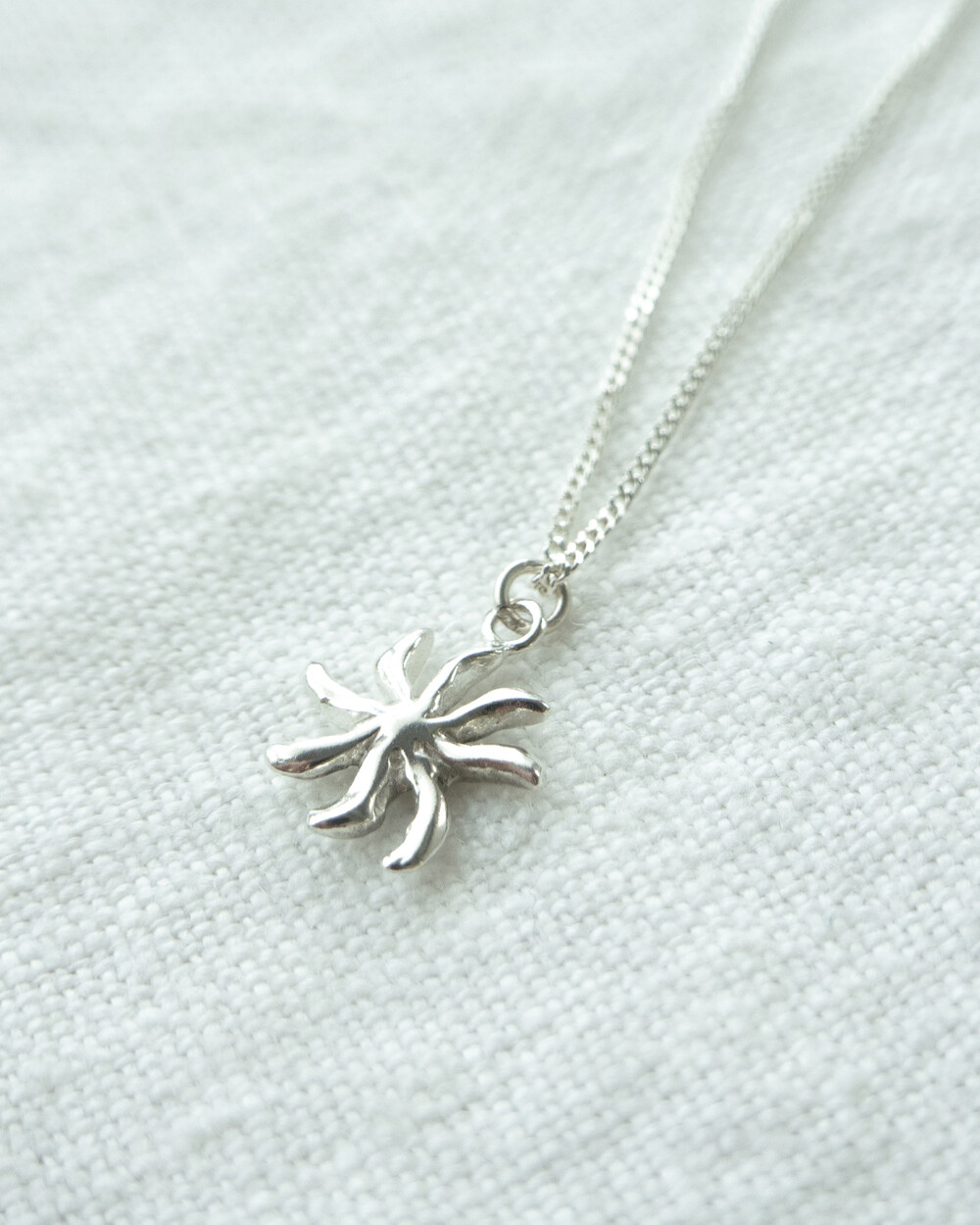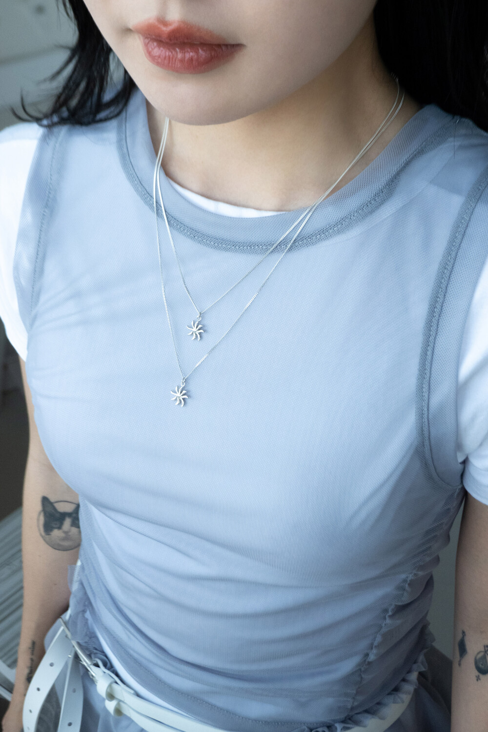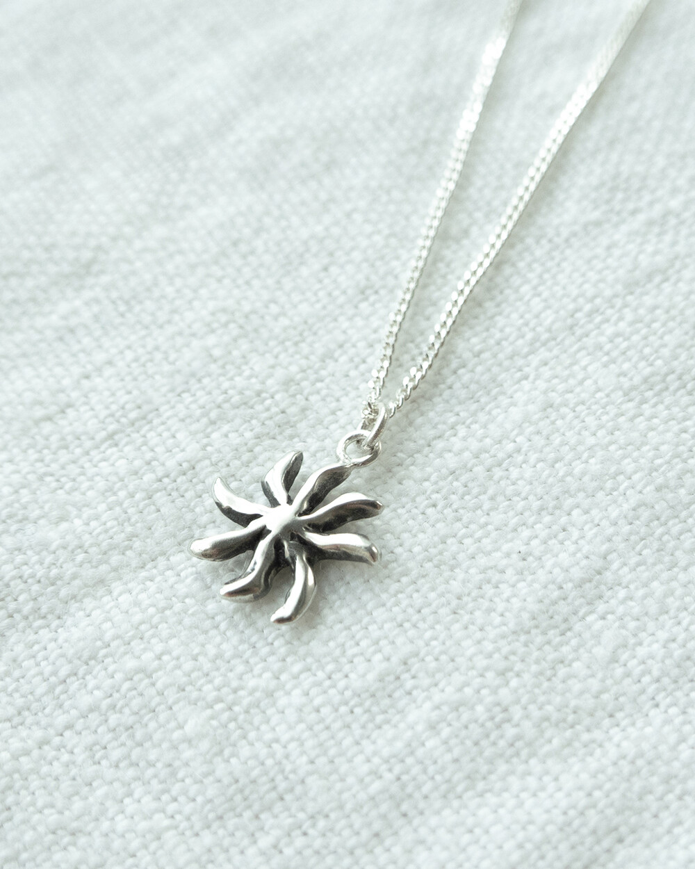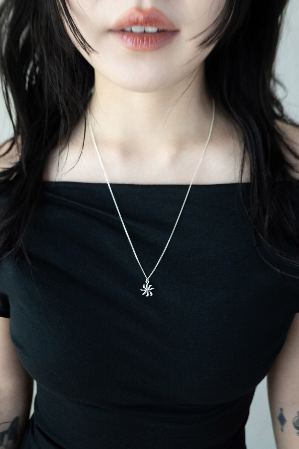 작은 태양 모양의 펜던트가 포인트가 되는 목걸이입니다. 자유로운 형태로 뻗은 디자인이 돋보이며, 가볍고 편하게 착용할 수 있도록 50~55cm의 여유로운 길이감으로 제작했습니다. 또한, 여유 체인 끝에 귀여운 돌멩이 모양의 펜던트를 더해 체인이 돌아가도 자연스럽게 포인트가 될 수 있도록 디자인했습니다. 반유광과 빈티지 질감 중 선택 가능합니다.