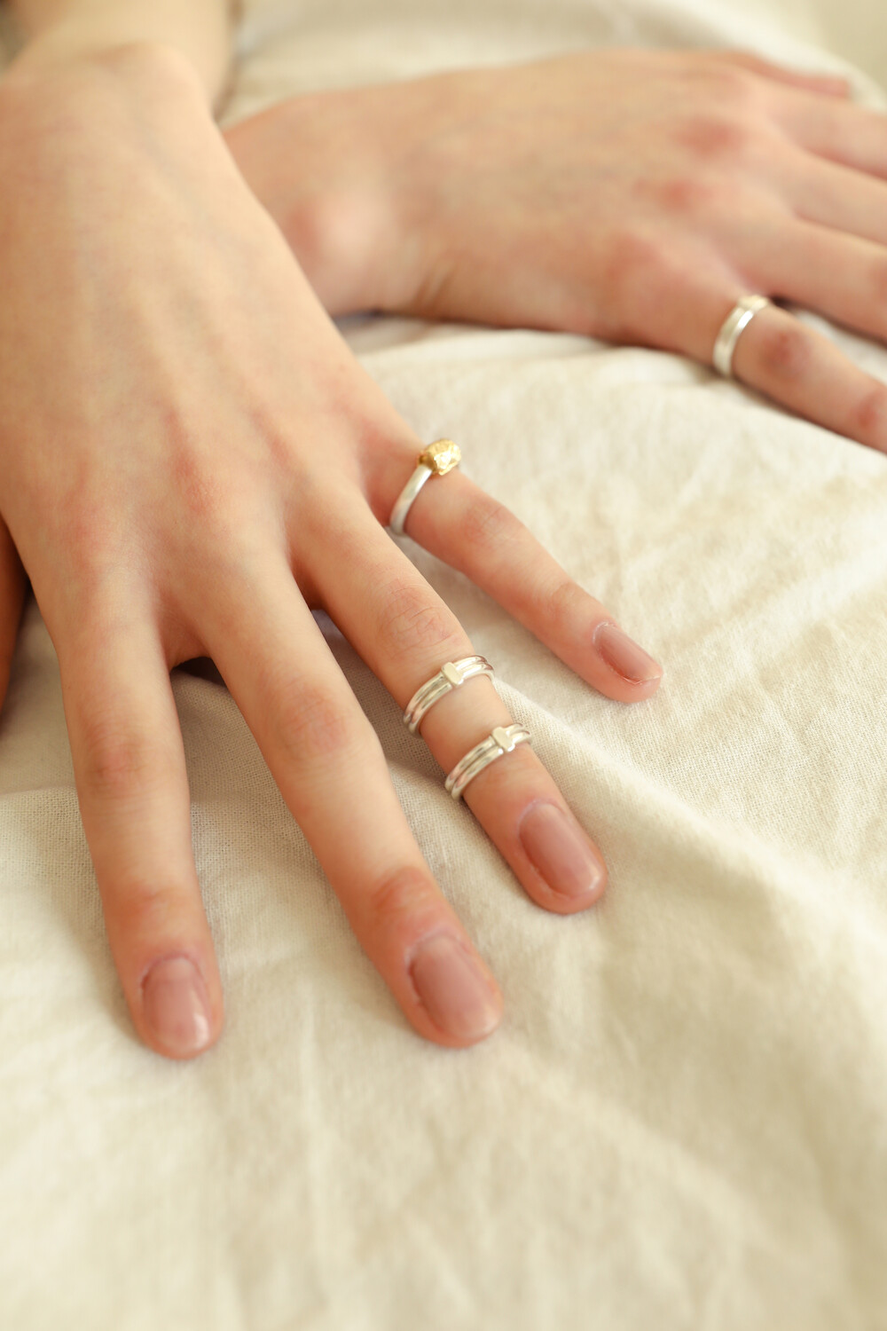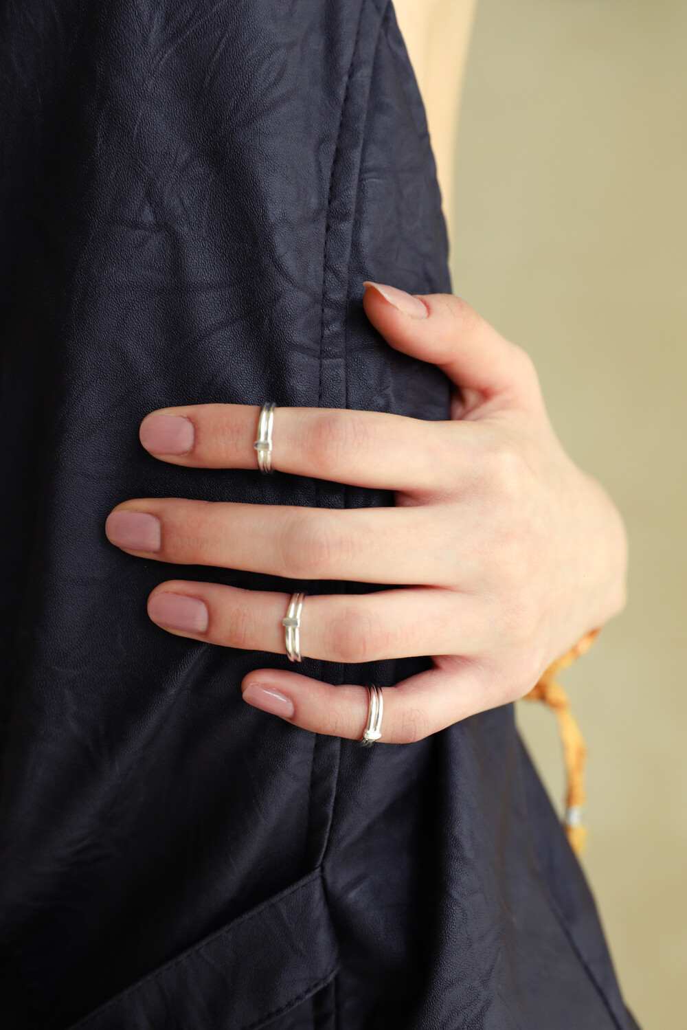 새끼손가락이나 마디에 착용하기 좋은 형태로 제작한 반지입니다. 볼드한 반지와 착용하여 대비되는 연출을 하거나 마디 반지를 여러 개 레이어드하여 착용해 보세요.