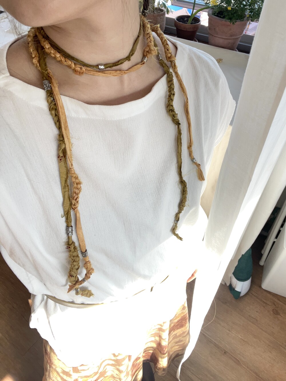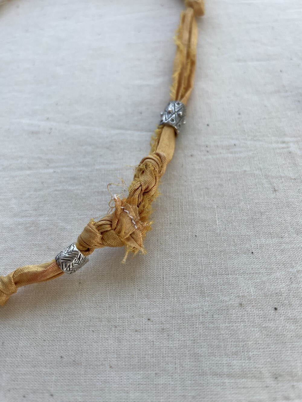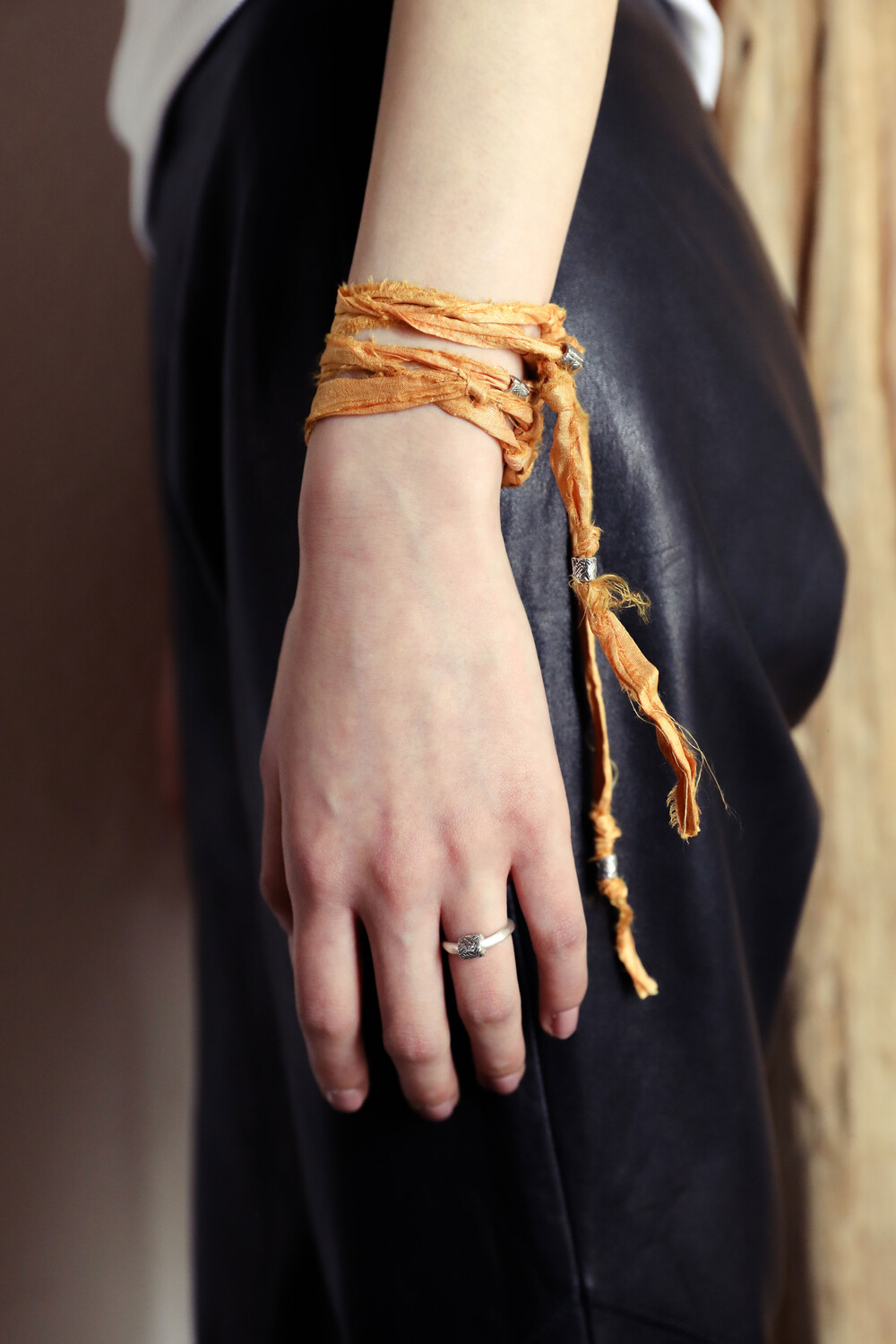 인도 실크로 제작한 노란빛의 스카프입니다. 중간중간 실버로 제작한 참이 달려있습니다. 직접 염색을 하는 제품이라 같이 생산한 실크로 제작해도 컬러와 무늬가 조금씩 다른 것이 특징입니다. 최대한 예쁜 컬러로 제작하여 보내드리며 이 점은 교환 및 반품 사유가 되지 않습니다.