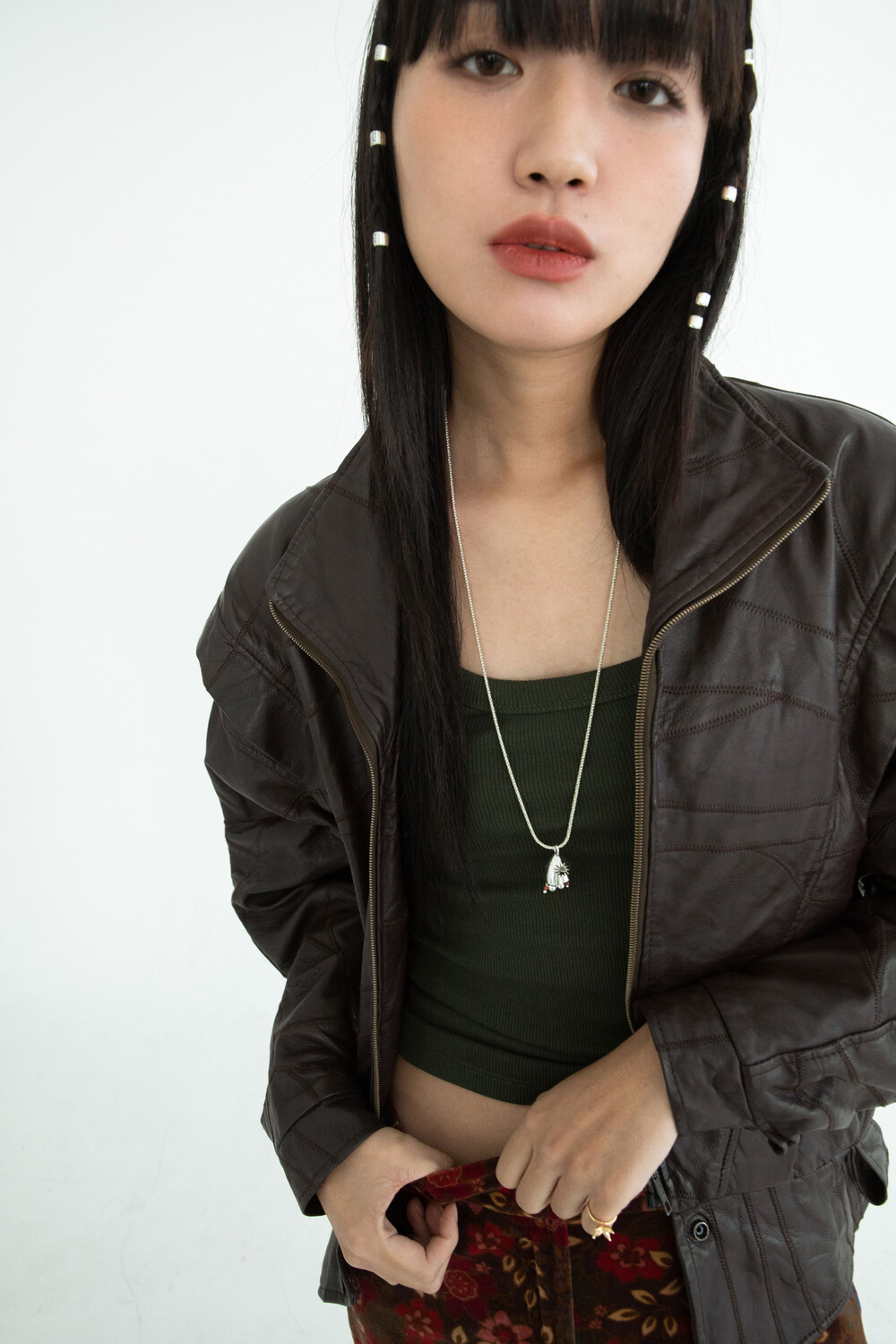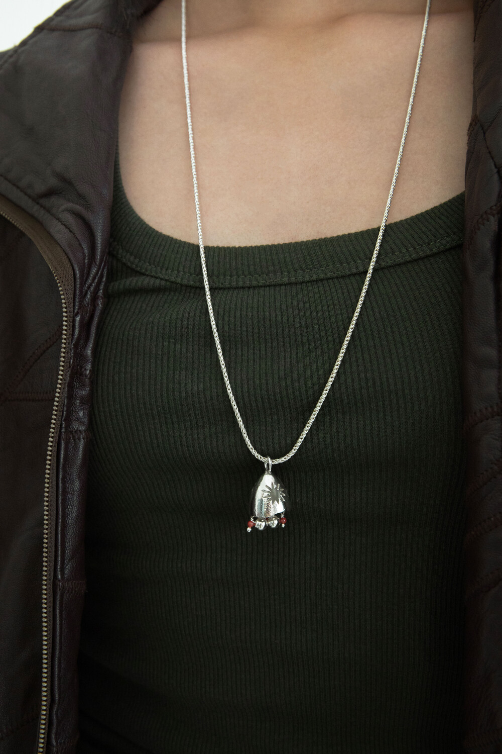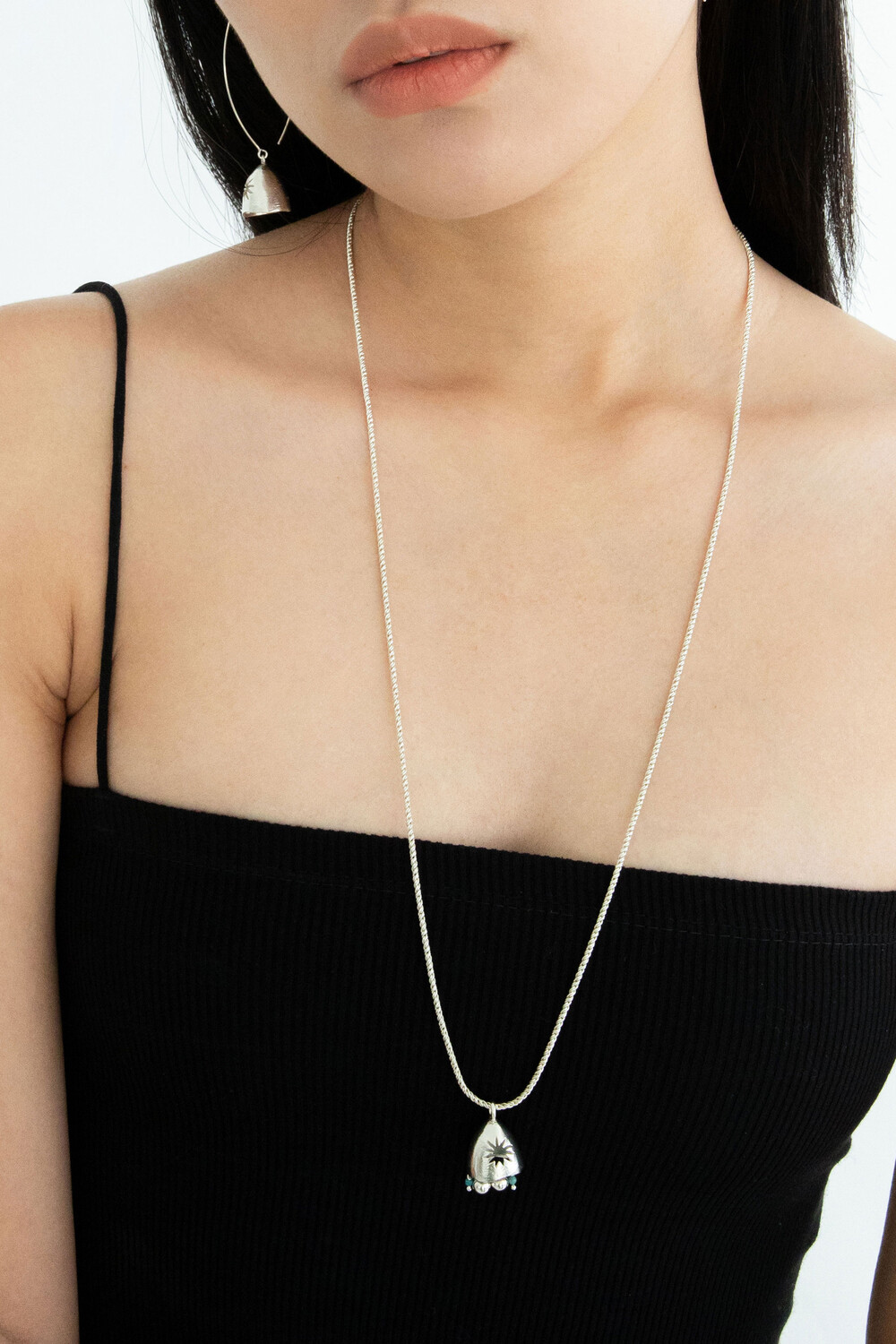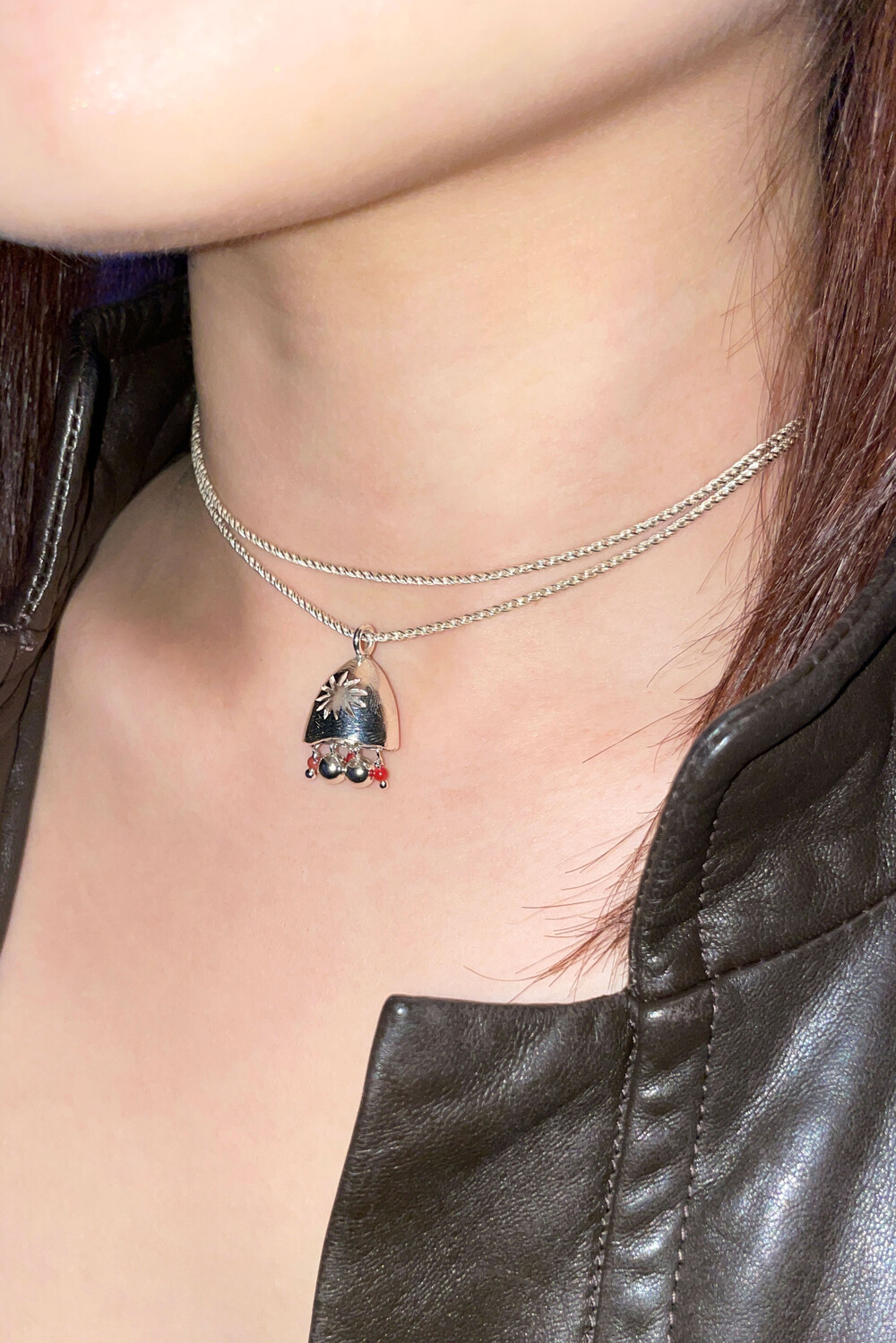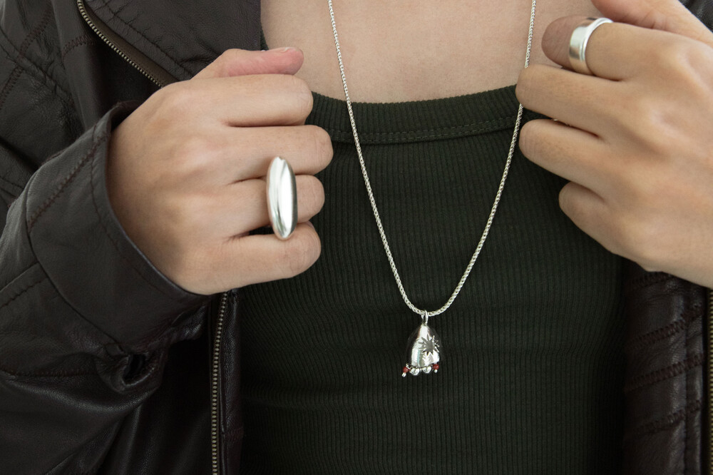 롱한 길이감의 꽈배기 체인과 독특한 펜던트의 조합이 매력적인 목걸이입니다. 펜던트에 있는 특유의 텍스처가 목걸이의 빈티지한 매력을 더해주며 긴 체인을 두 번 감아 초커로도 활용이 가능합니다.