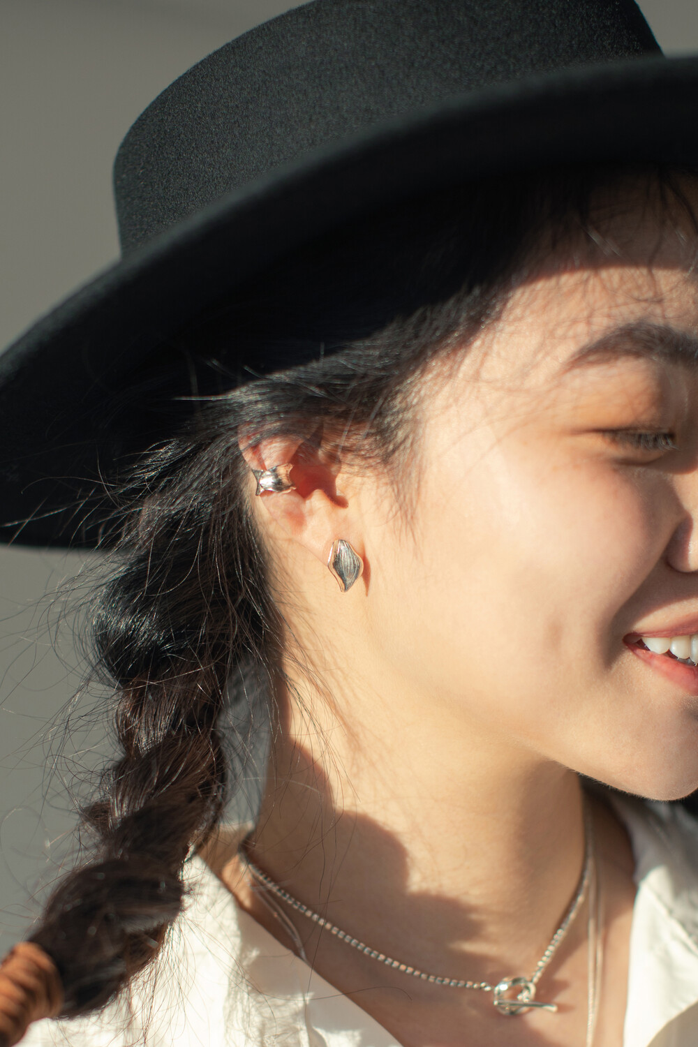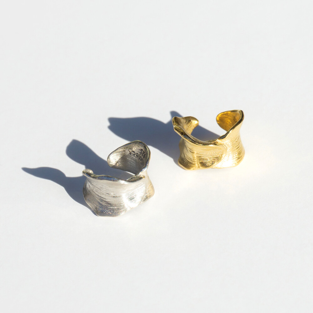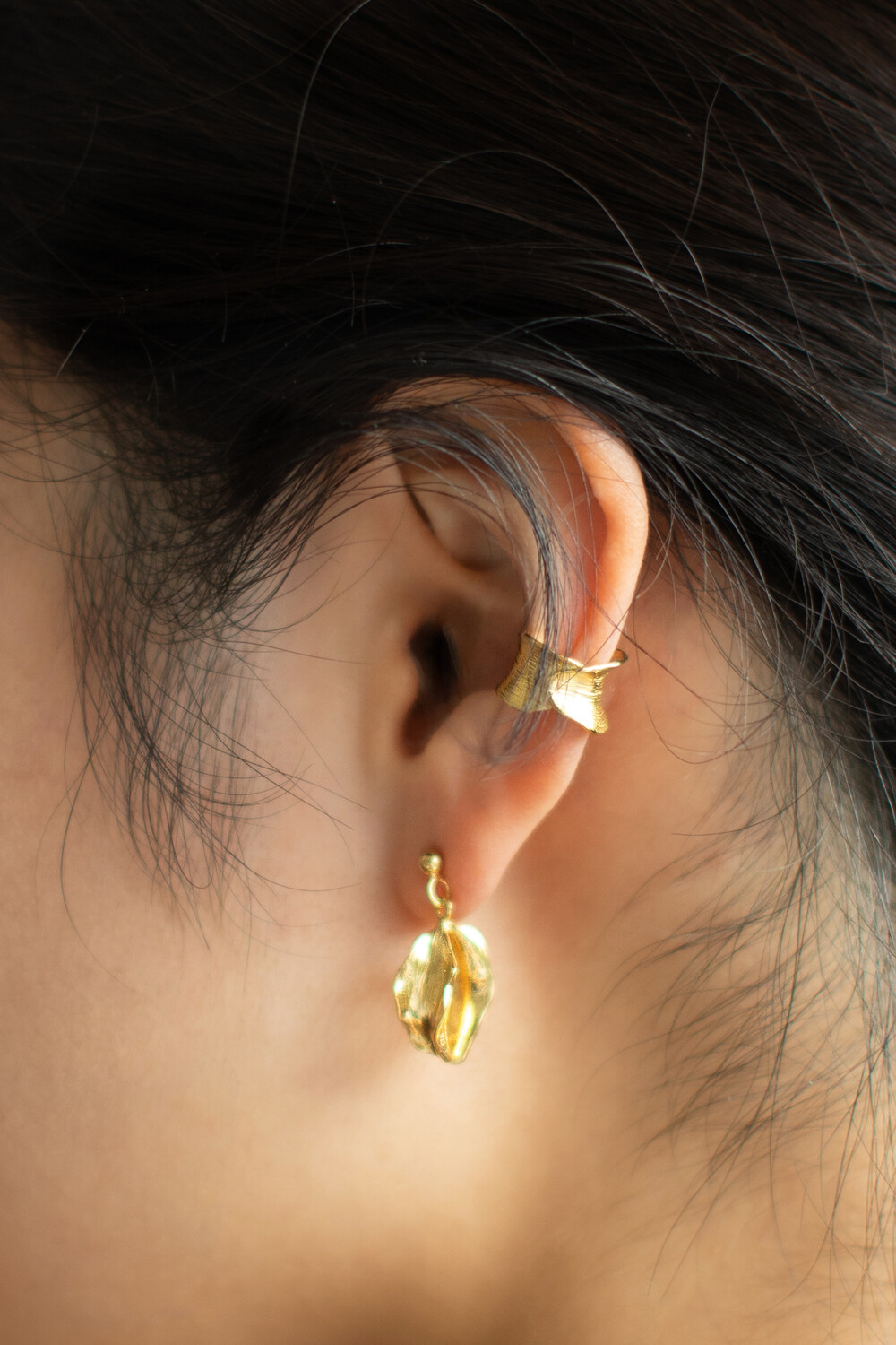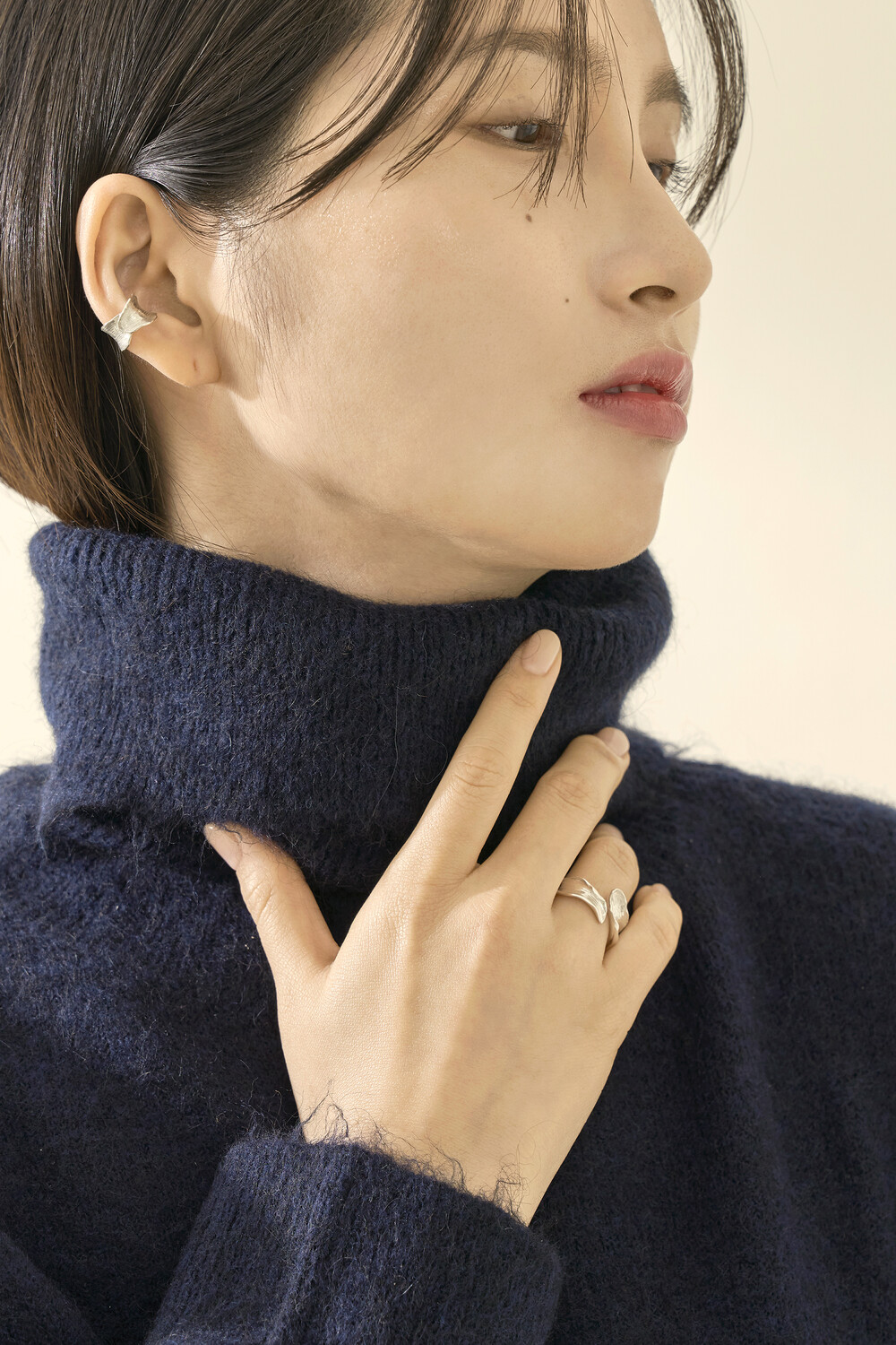 두 장의 꽃잎이 겹쳐진 형태에 세밀하게 표현된 질감이 더해진 이어커프입니다. 전체적으로 매트한 무광 텍스쳐에 모서리 부분만 유광으로 포인트를 주어 독특한 질감이 주는 매력이 있습니다. 가벼운 착용감으로 장시간 착용하여도 불편함이 없습니다. 처음 착용 시에는 제품에 살짝 힘을 주어 자신의 귀 모양에 맞춘 후 착용하는 것을 추천드립니다. 단, 무리한 변형 시 제품이 망가질 수 있으니 주의해주세요.