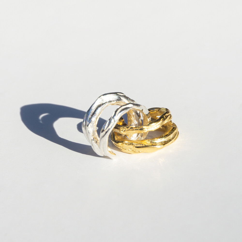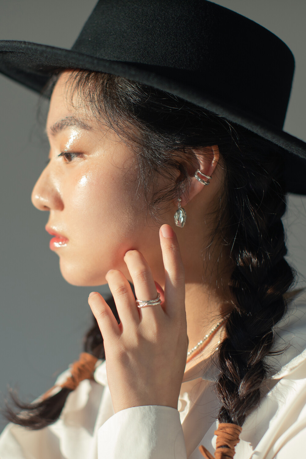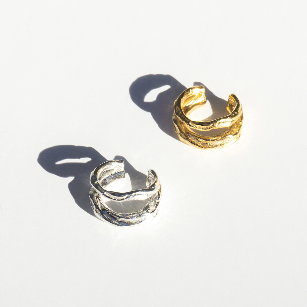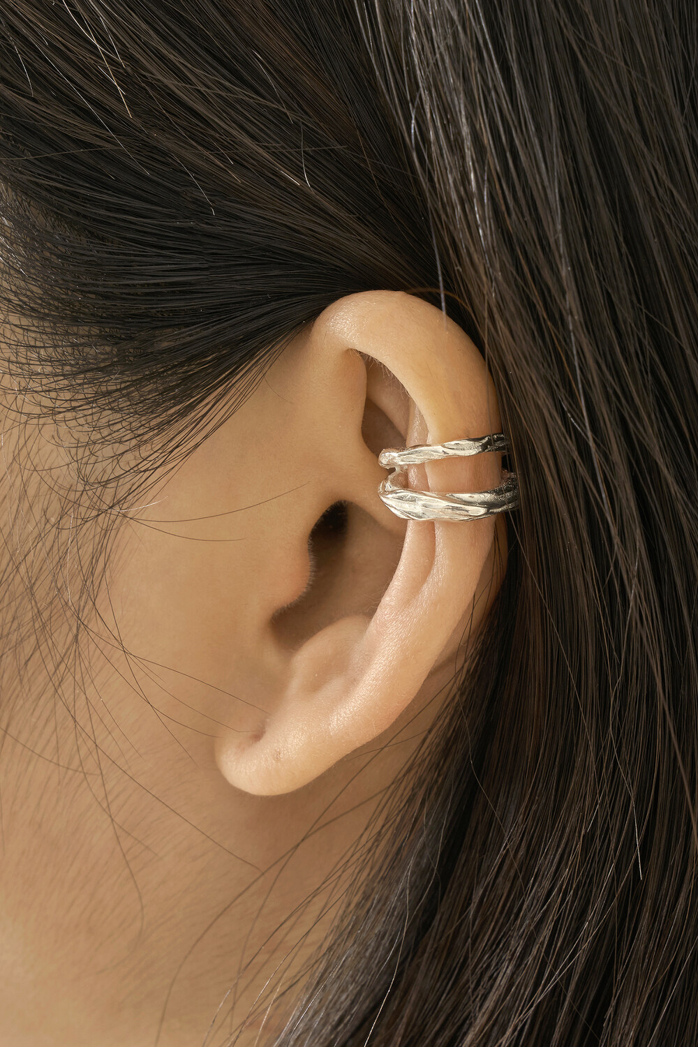 자연의 질감을 담은 러프한 텍스쳐가 매력적인 이어커프입니다. 두개를 레이어드하여 착용한 듯한 디자인이 특징입니다. 단일로만 착용해도 좋은 포인트가 되는 제품으로 귀걸이를 자주 착용하지 않는 분들께도 추천드립니다. 가벼운 착용감으로 장시간 착용하여도 불편함이 없습니다. 처음 착용 시에는 제품에 살짝 힘을 주어 자신의 귀 모양에 맞춘 후 착용하는 것을 추천드립니다. 단, 무리한 변형 시 제품이 망가질 수 있으니 주의해주세요.