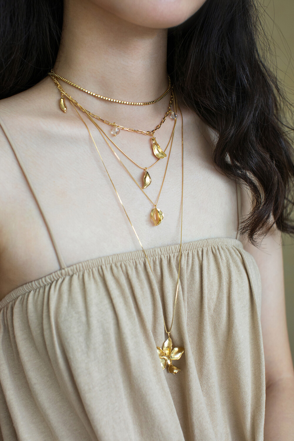 롱한 길이감으로 심심한 착장에 포인트를 주기 좋은 팬던트 목걸이입니다. 얇은 박스 체인을 사용하여 다양한 각도에서 빛이 반사되는 것이 특징입니다. 맨투맨이나 니트와 같은 의상과 캐주얼하게 매치해보세요.