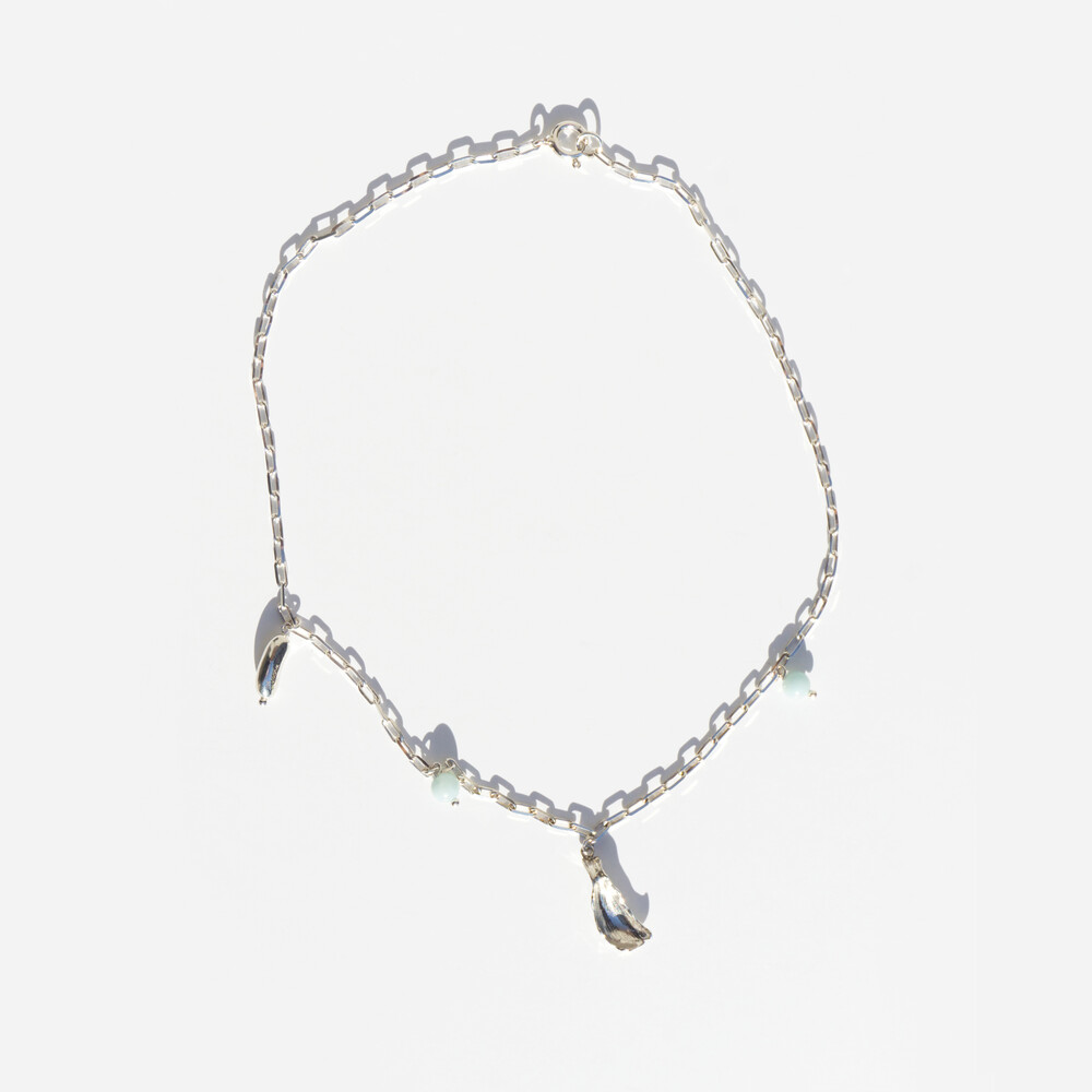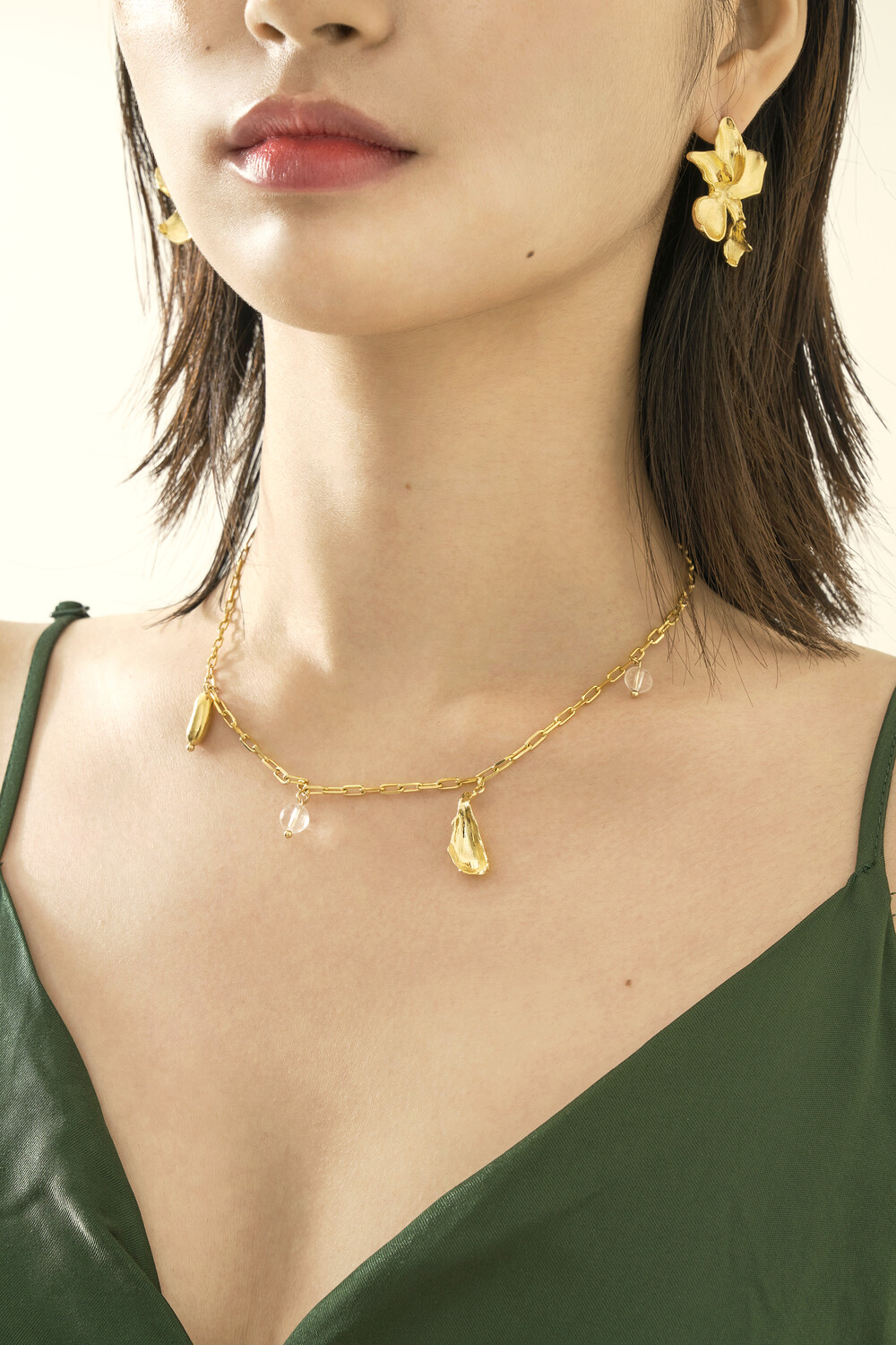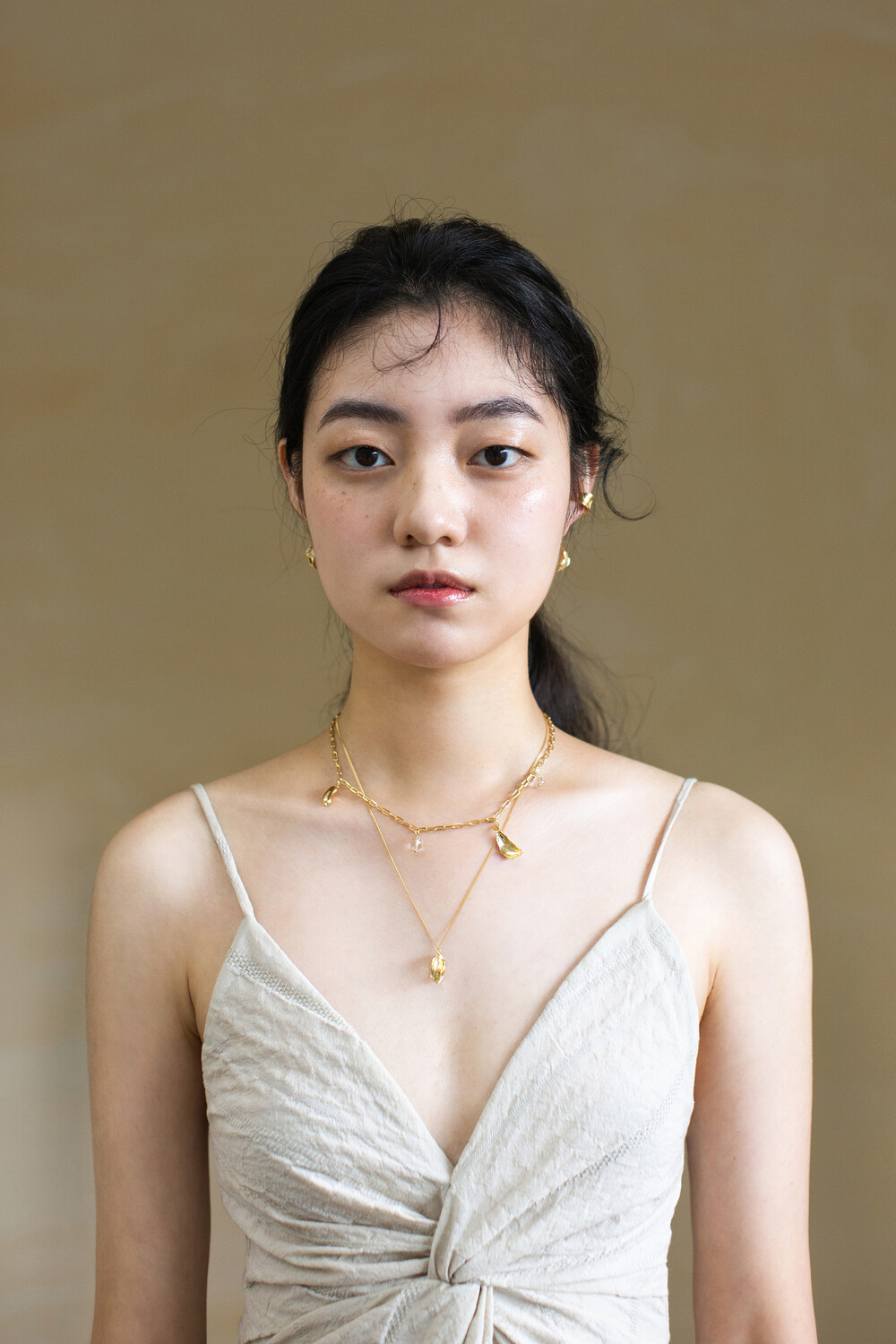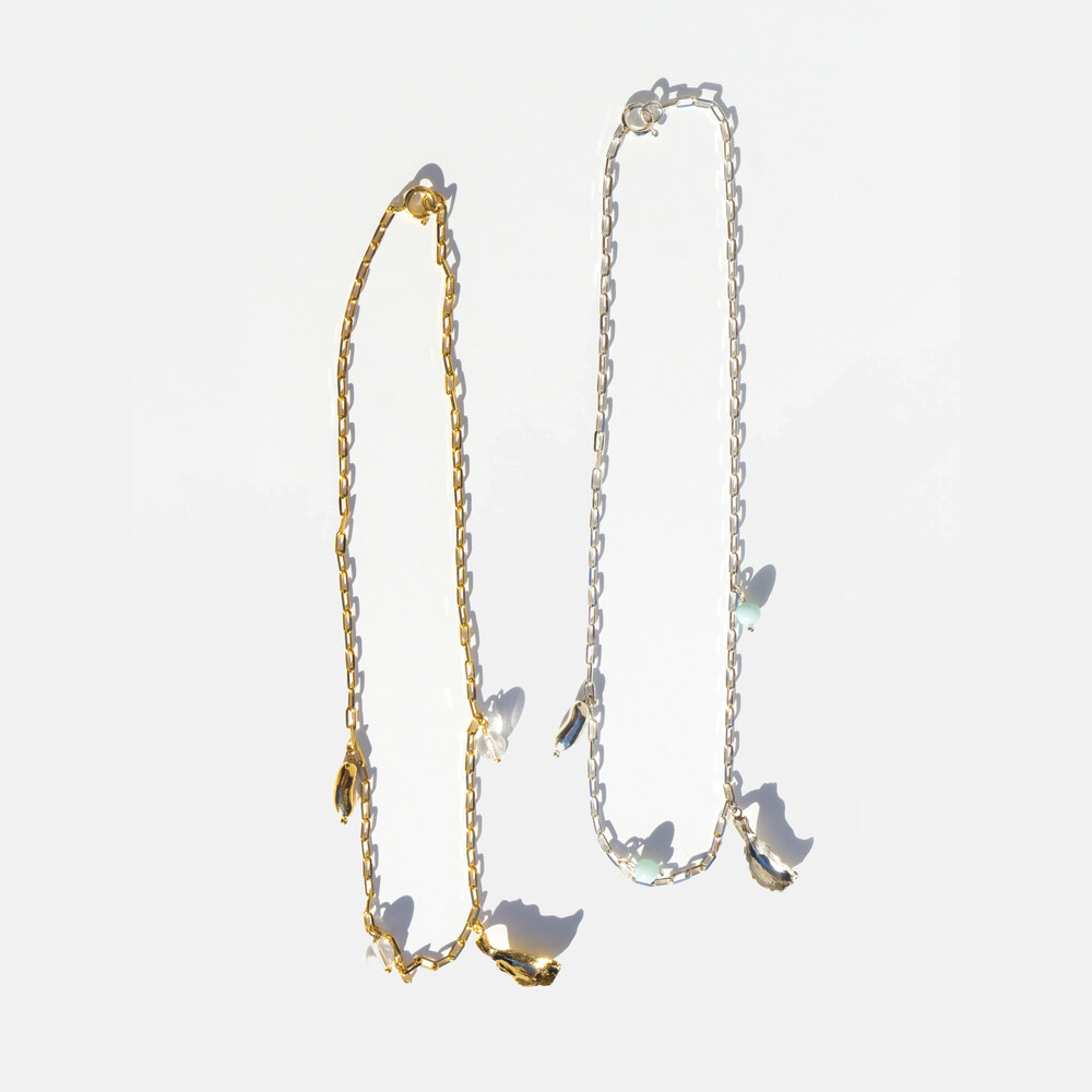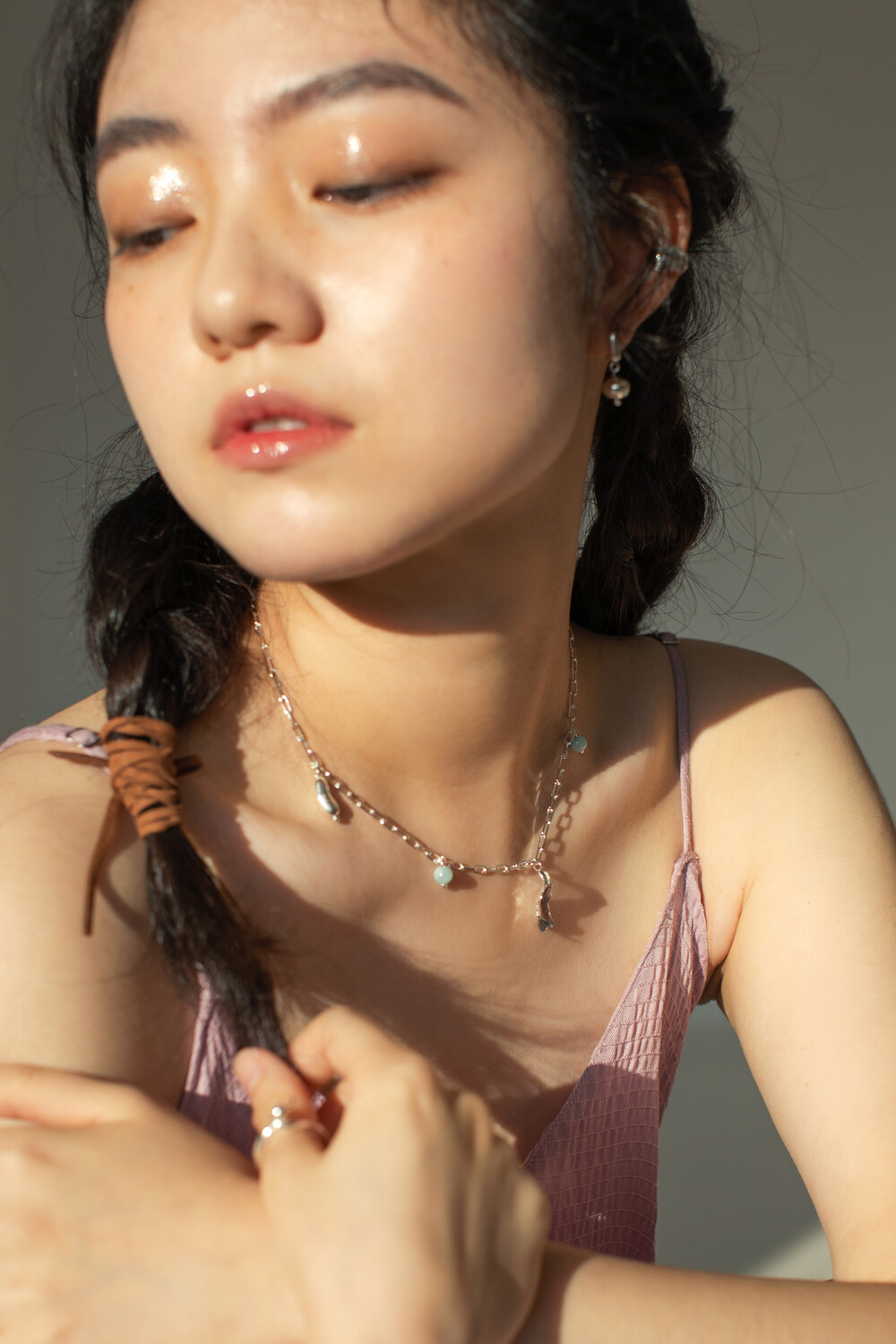 작은 천연석과 반짝이는 금속 참이 달린 초커 타입의 목걸이입니다. 체인에 주렁주렁 달려있는 팬던트들이 사랑스러운 분위기를 연출해줍니다. 따뜻한 하늘빛의 아마조나이트와 투명한 크리스탈 중 선택이 가능합니다. 오프숄더 상의나 맨투맨 위에 캐주얼하게 착용해 보세요.