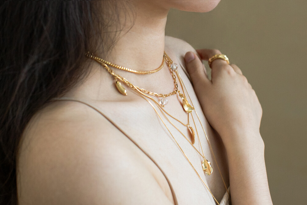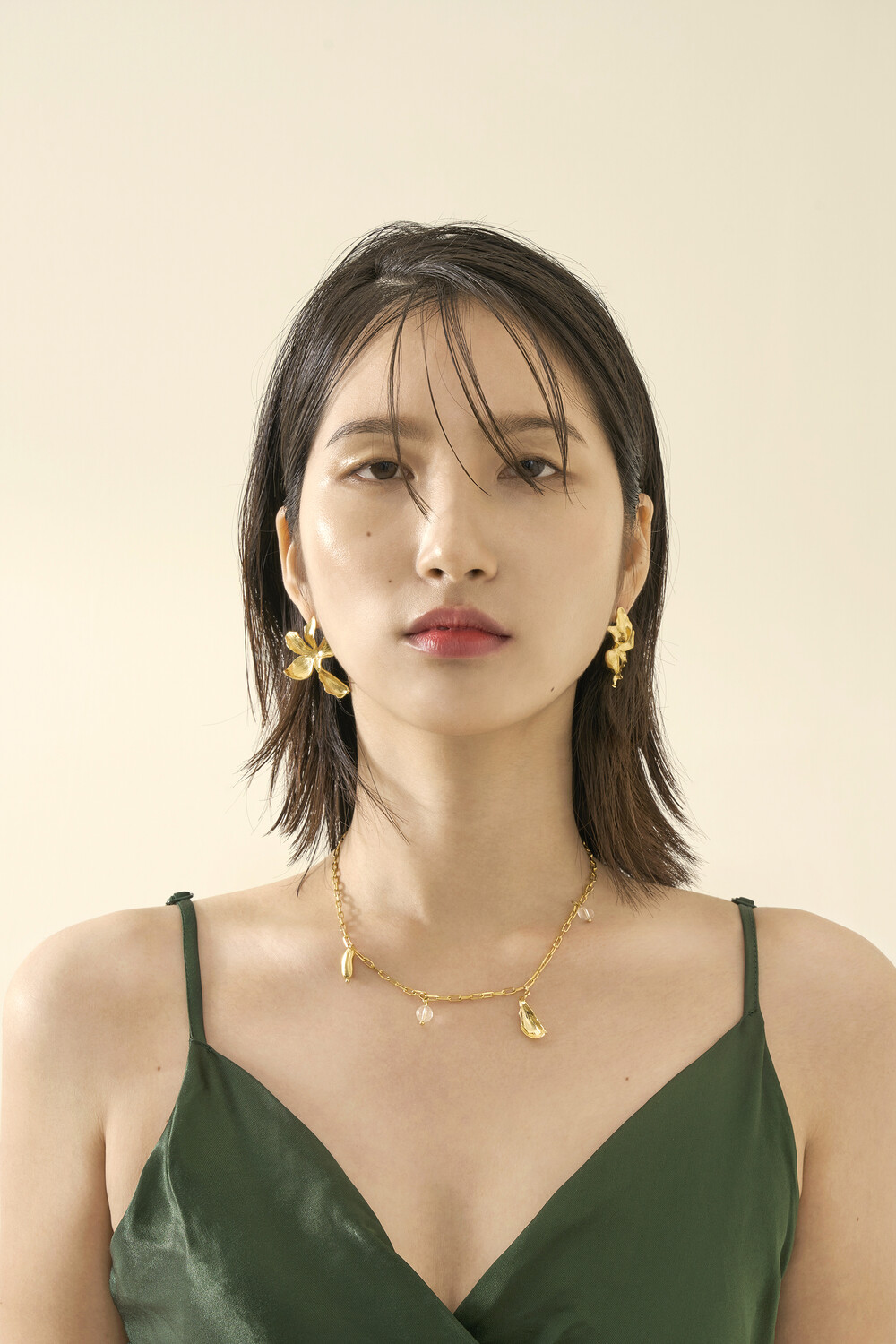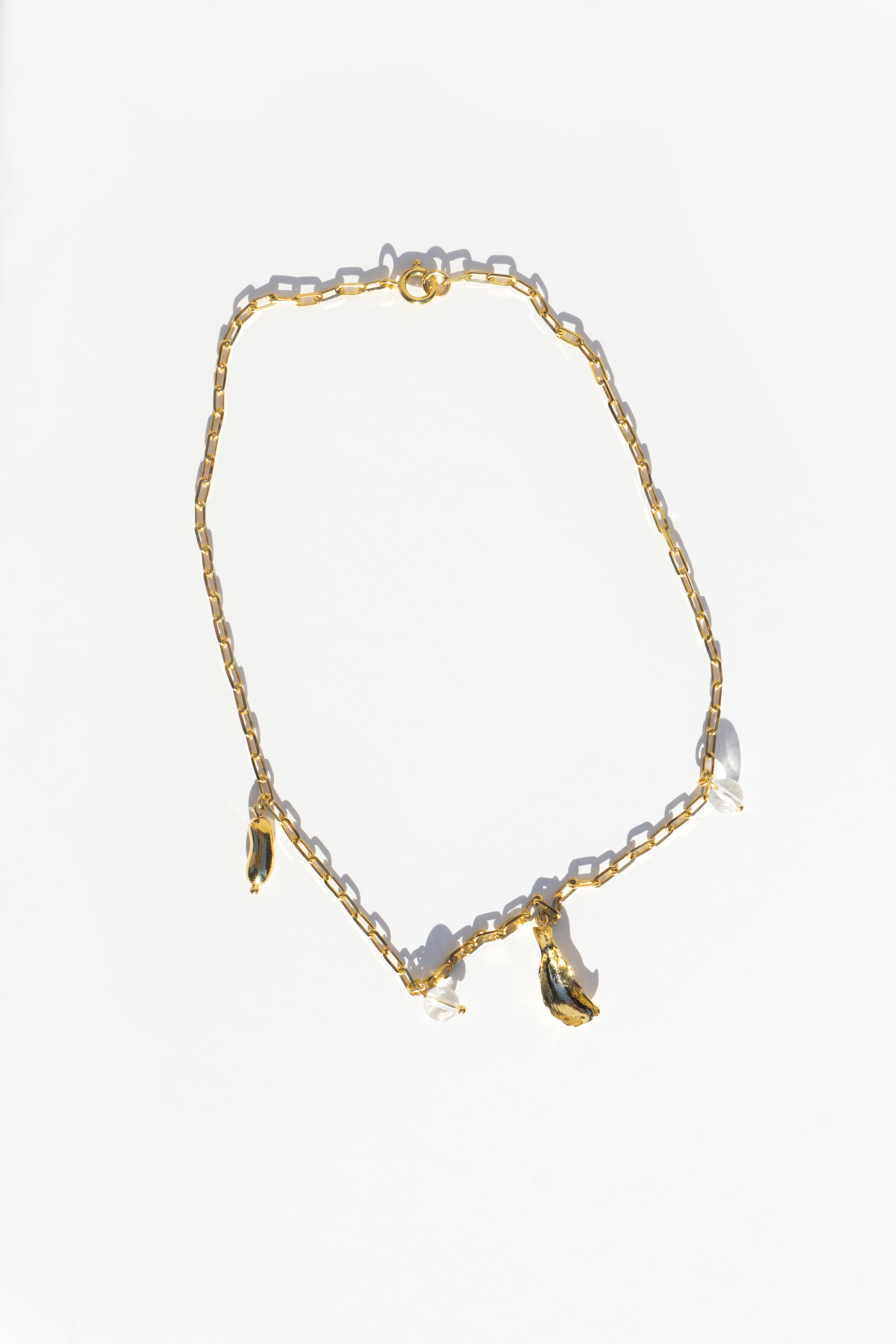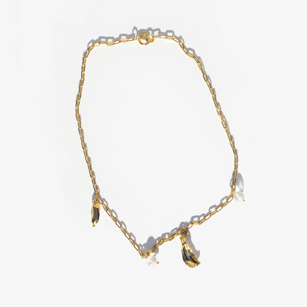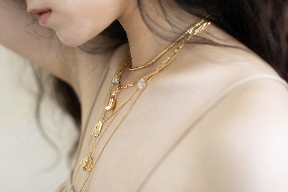 작은 천연석과 반짝이는 금속 참이 달린 초커 타입의 목걸이입니다. 체인에 주렁주렁 달려있는 팬던트들이 사랑스러운 분위기를 연출해줍니다. 따뜻한 하늘빛의 아마조나이트와 투명한 크리스탈 중 선택이 가능합니다. 오프숄더 상의나 맨투맨 위에 캐주얼하게 착용해 보세요.