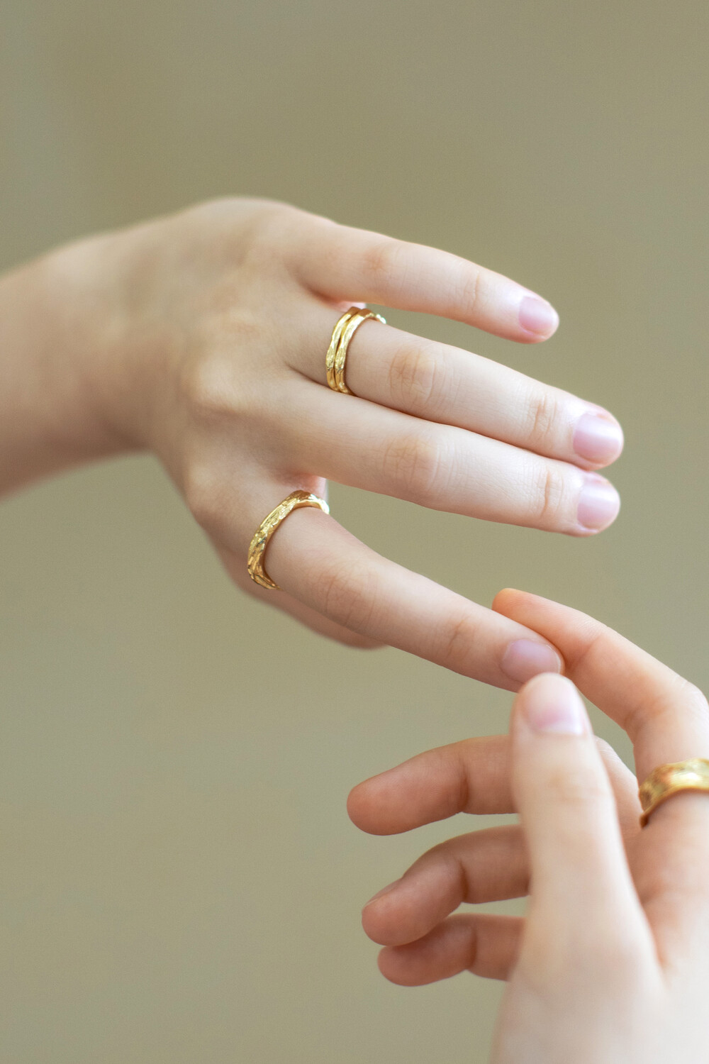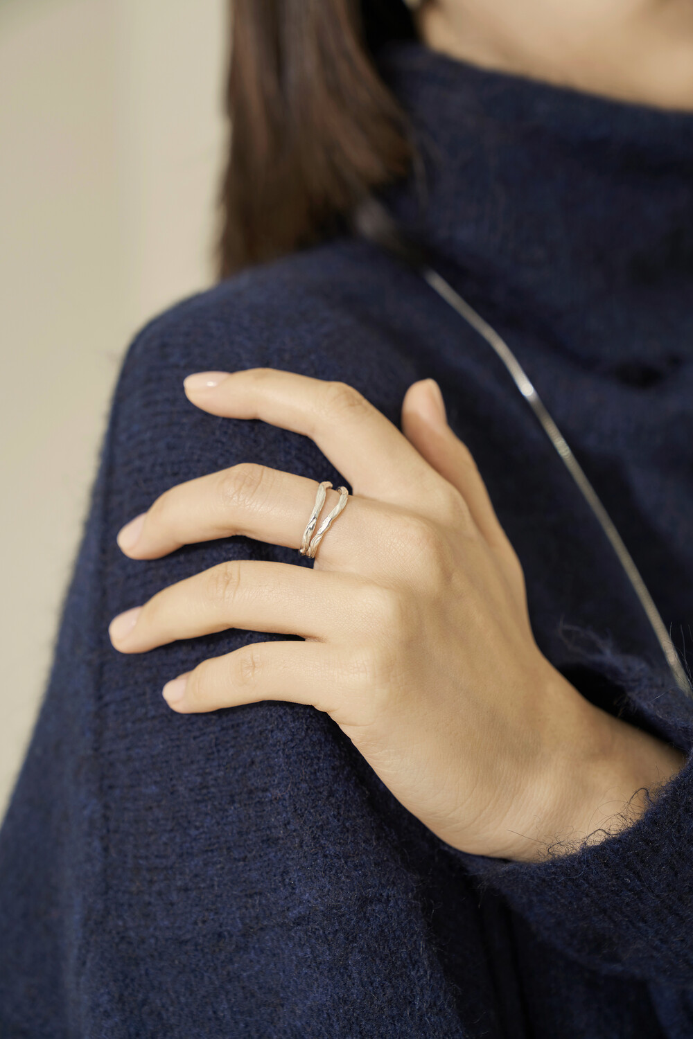 자연의 질감을 담은 반지입니다. WF14R 보다 얇은 두께감이 특징이며 다른 제품과 레이어드 하기 좋은 디자인입니다. 얇은 형태감으로 착용이 용이한 제품입니다. 정사이즈 보다 1호수 작게 주문해주세요.
