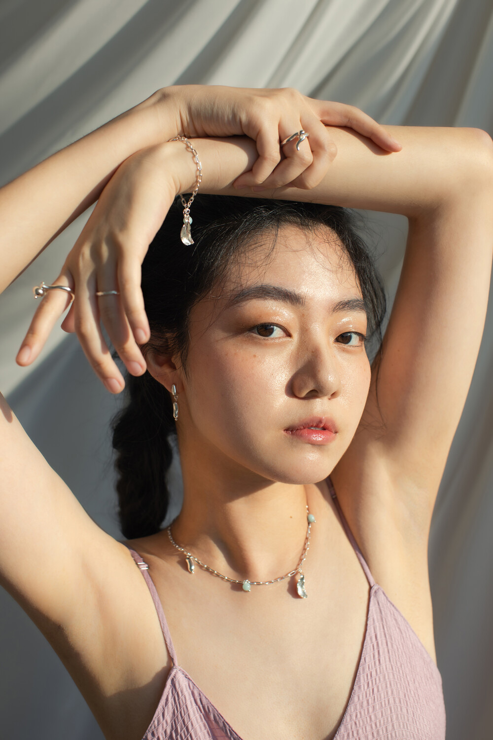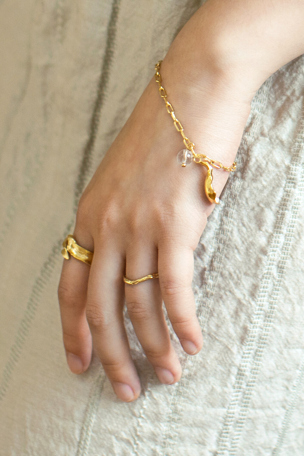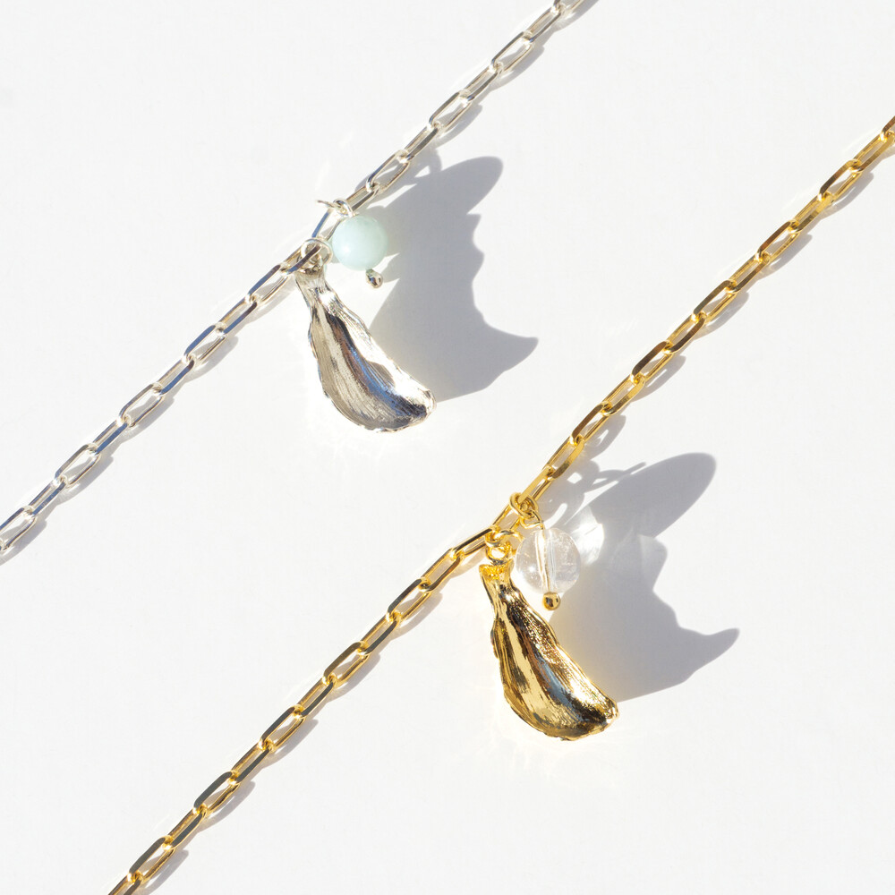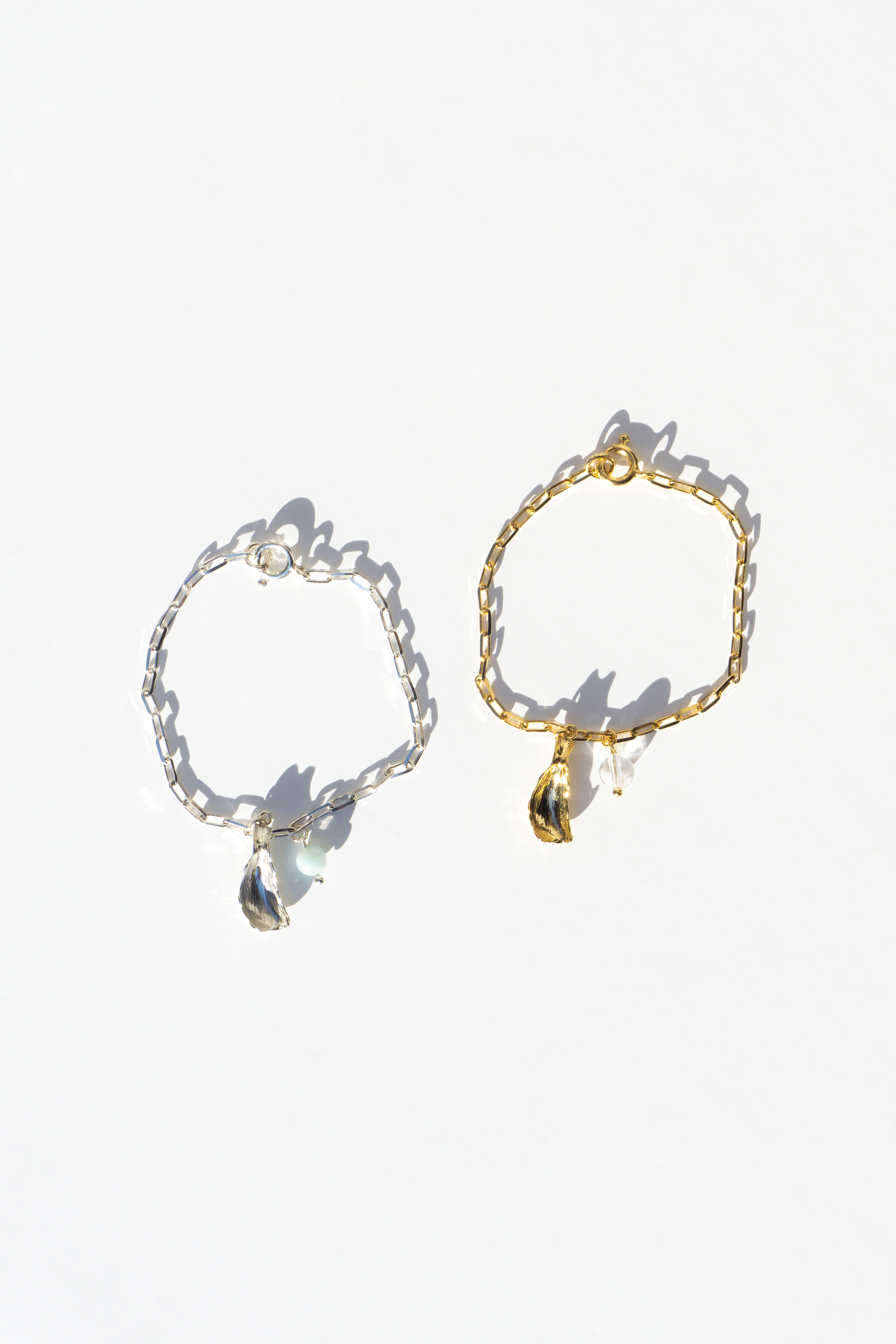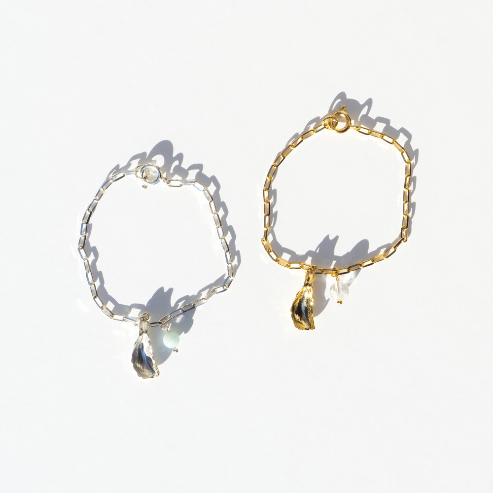 작은 천연석과 반짝이는 금속 참이 달린 체인 팔찌입니다. 체인에 주렁주렁 달려있는 펜던트들이 사랑스러운 분위기를 연출해줍니다. 자체적으로 길이 조절이 가능한 체인을 사용하였으며 원석은 따뜻한 하늘빛의 아마조나이트와 투명한 크리스탈 중 선택이 가능합니다.