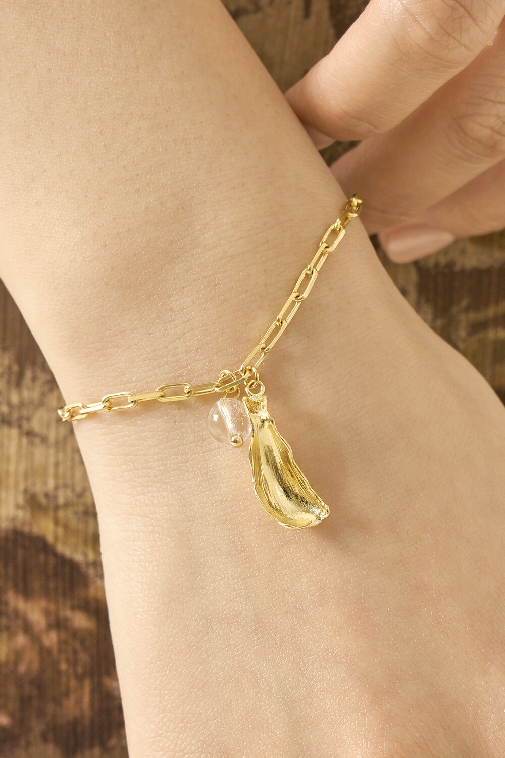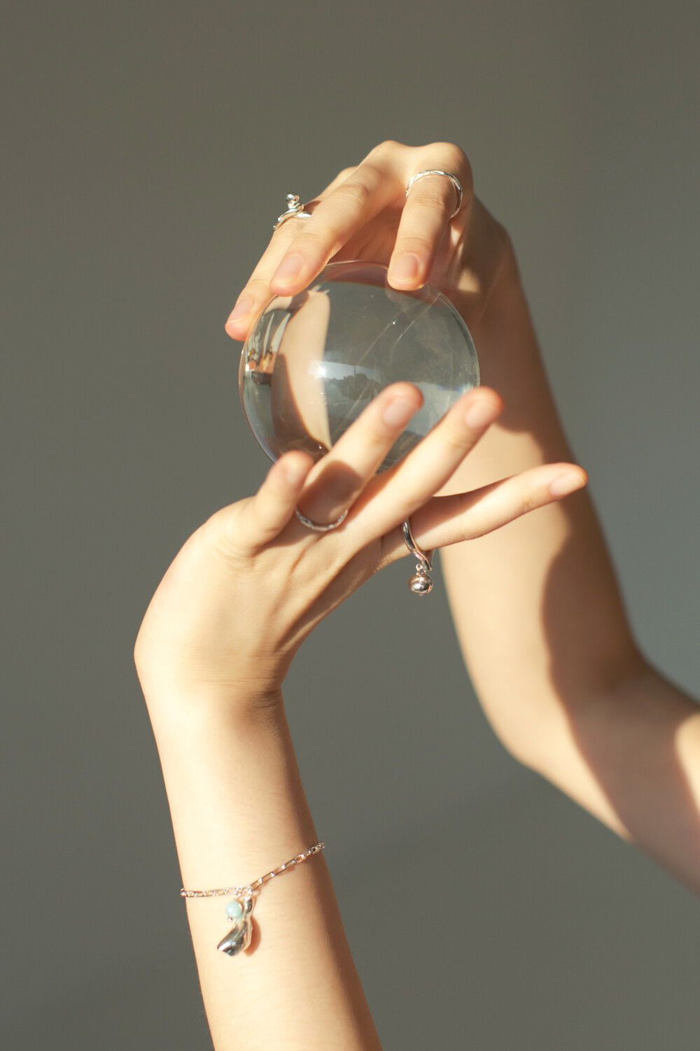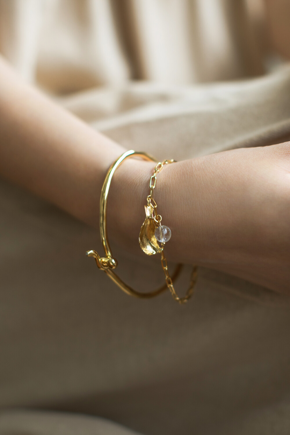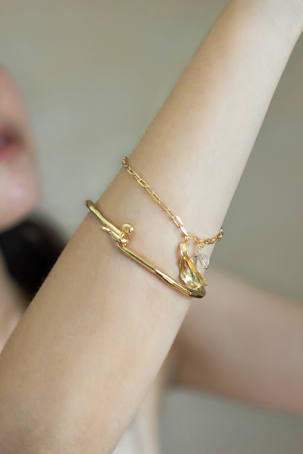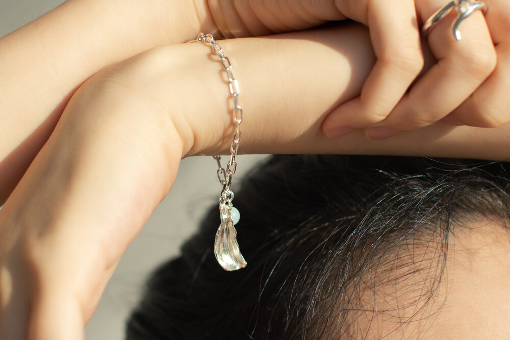 작은 천연석과 반짝이는 금속 참이 달린 체인 팔찌입니다. 체인에 주렁주렁 달려있는 펜던트들이 사랑스러운 분위기를 연출해줍니다. 자체적으로 길이 조절이 가능한 체인을 사용하였으며 원석은 따뜻한 하늘빛의 아마조나이트와 투명한 크리스탈 중 선택이 가능합니다.