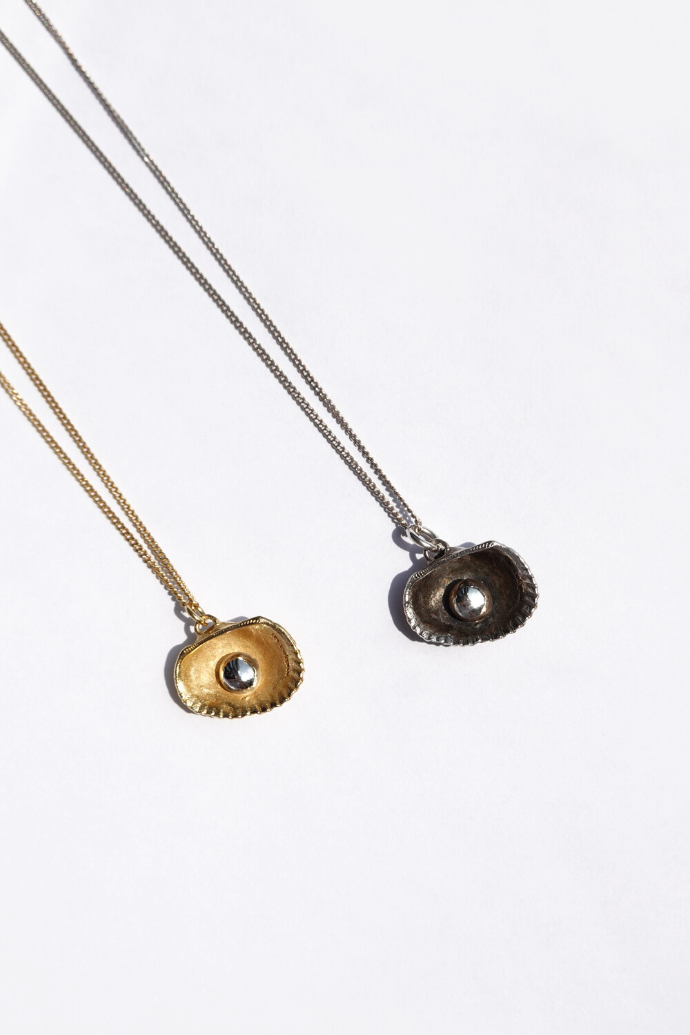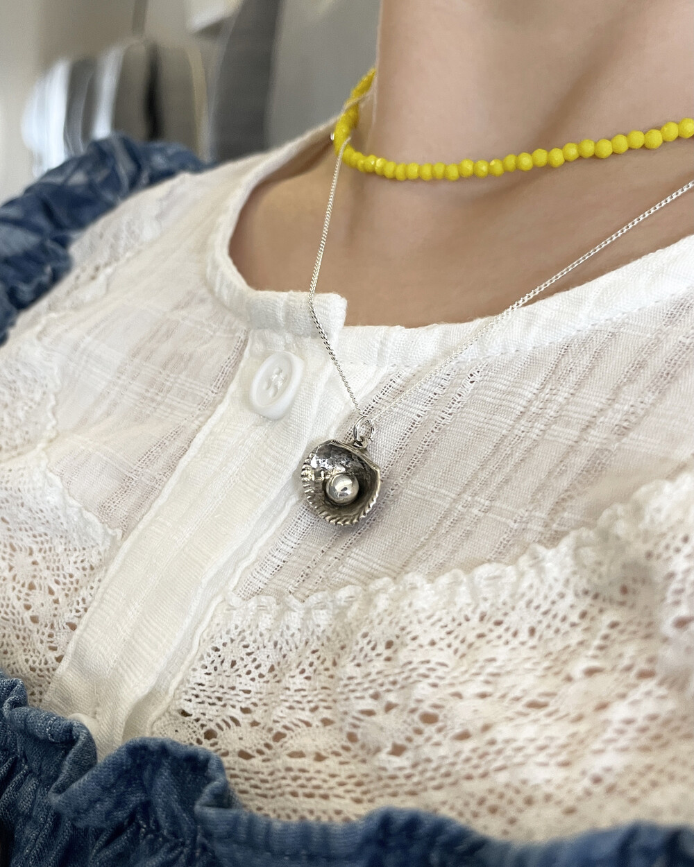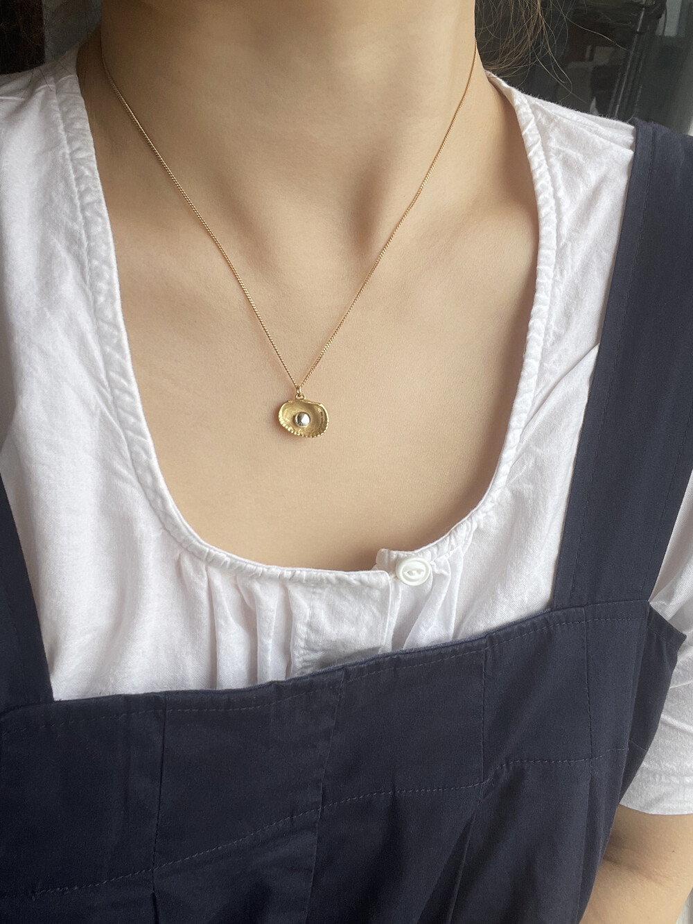 그날을 추억하며 그날 주웠던 가장 작고 예쁜 모양의 조개를 골라 목걸이를 만들었습니다. 그날을 영원히 간직하고 싶은 마음을 담아 실제 진주가 아닌 금속으로 진주의 모양을 표현하였습니다. 컬러는 실버와 골드 두 가지로 구성되어 있습니다. 실버 컬러는 빈티지한 유화 착색으로 표현하였고, 골드 컬러는 진주 부분만 화이트 골드로 도금하여 재미있는 포인트를 주었습니다. 기본 체인은 42cm이나 여유 체인 3cm가 있어 다양한 연출이 가능한 제품입니다.