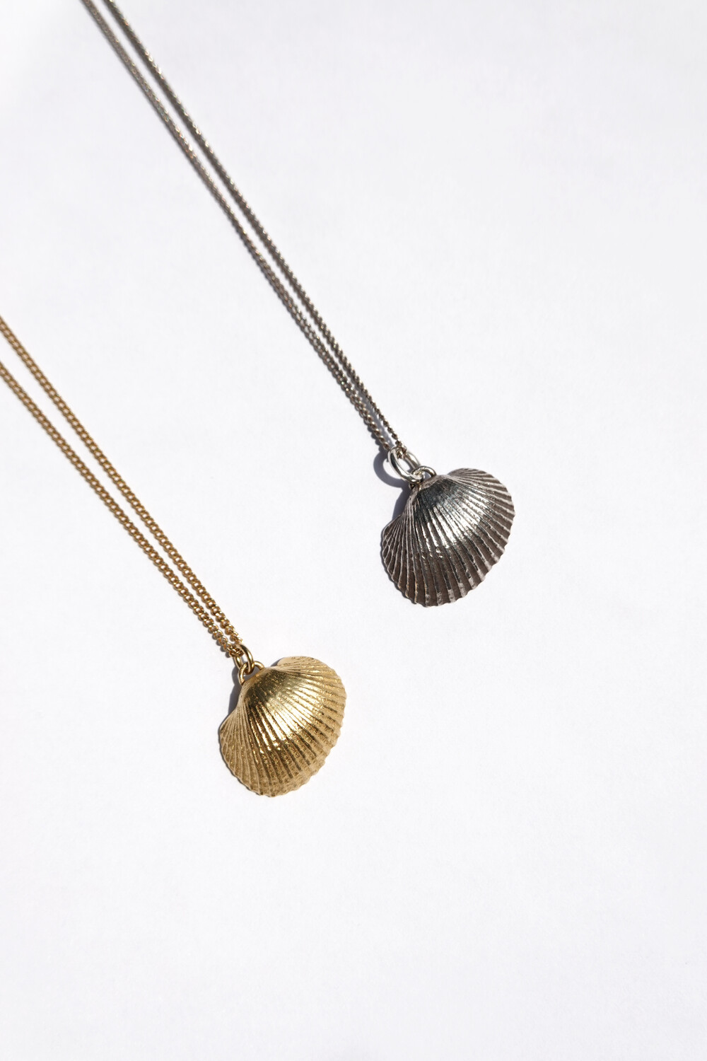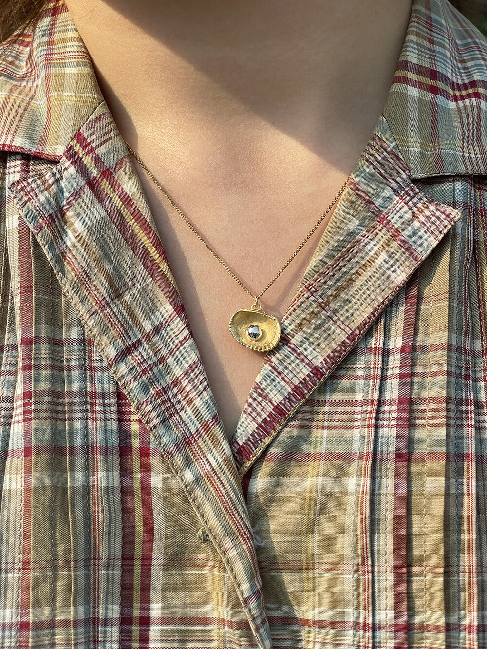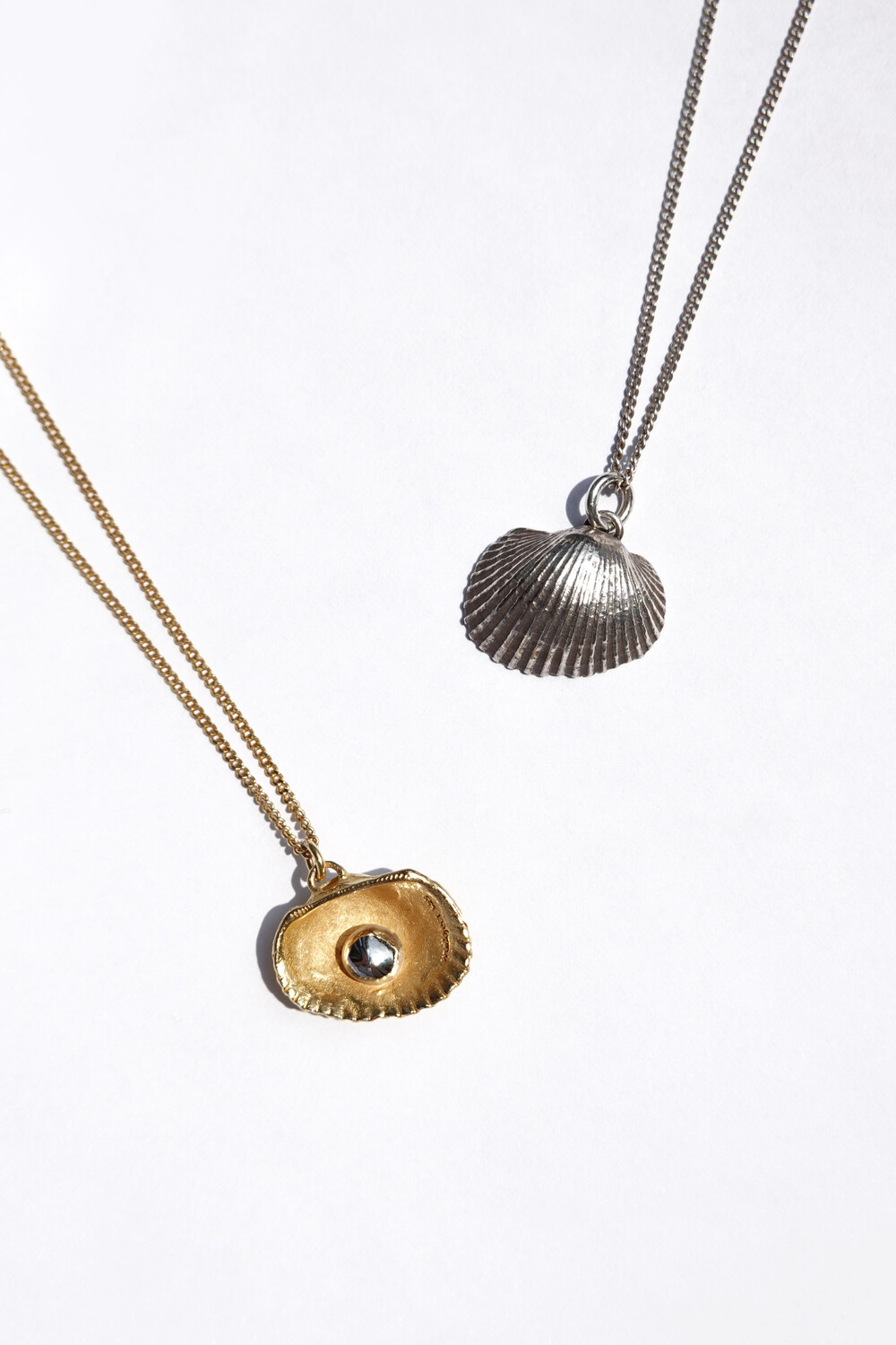 그날을 추억하며 그날 주웠던 가장 작고 예쁜 모양의 조개를 골라 목걸이를 만들었습니다. 그날을 영원히 간직하고 싶은 마음을 담아 실제 진주가 아닌 금속으로 진주의 모양을 표현하였습니다. 컬러는 실버와 골드 두 가지로 구성되어 있습니다. 실버 컬러는 빈티지한 유화 착색으로 표현하였고, 골드 컬러는 진주 부분만 화이트 골드로 도금하여 재미있는 포인트를 주었습니다. 기본 체인은 42cm이나 여유 체인 3cm가 있어 다양한 연출이 가능한 제품입니다.